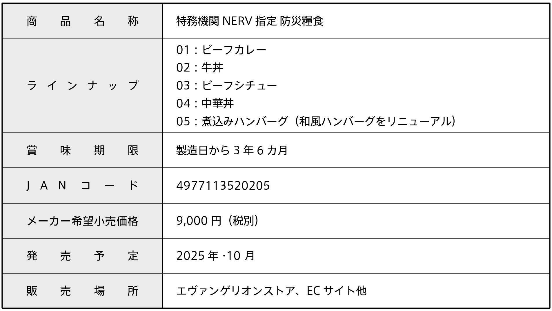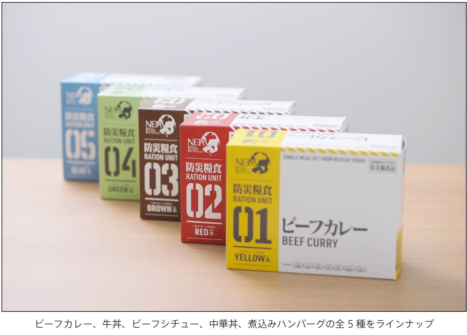 この「防災糧食」は、『エヴァンゲリオン』の作中に登場する特務機関NERV が、第3新東京市の防災備蓄品として指定・配備しているという独自の設定をコンセプトに開発されたもので、特務機関NERV防災アプリの開発等を行っているゲヒルン株式会社の協力のもと、専用パッケージを制作しました。
