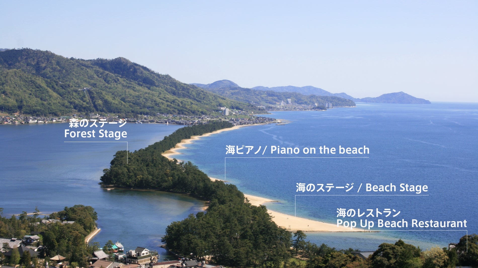 全長3.6kmの砂洲に約6,700本の松が生い茂る荘厳な景色の中で、天橋立の白い砂浜と水平線を借景に建てる「海のステージ/Beach Stage」、数百年の時を経て息づく木々と名水・磯清水に囲まれた「森のステージ/Forest Stage」、絶景の砂浜に置かれた駅ピアノならぬ「海ピアノ/Piano on the beach」、3カ所にステージを設け、日本を含め世界中から生音で“今”聴きたい個性的なミュージシャンを集め「KYOTOPHONIE 2023 天橋立」 を開催します。