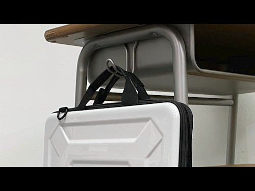 教室で机の脇にパソコンバッグをぶら下げている状態から、タブレットを取り出そうとする時に一般のバッグは落下する危険性があります。PCまもるくんは「パカガシャ防止ベルト」により落下を防止します。