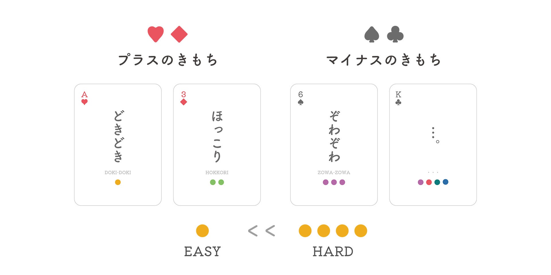❤️♦️=ポジティブなきもち・♣️♠︎=ネガティブなきもちと捉えられるものを分類しているので、ポジティブなきもちだけで場をあたためたい時などにも使えます。