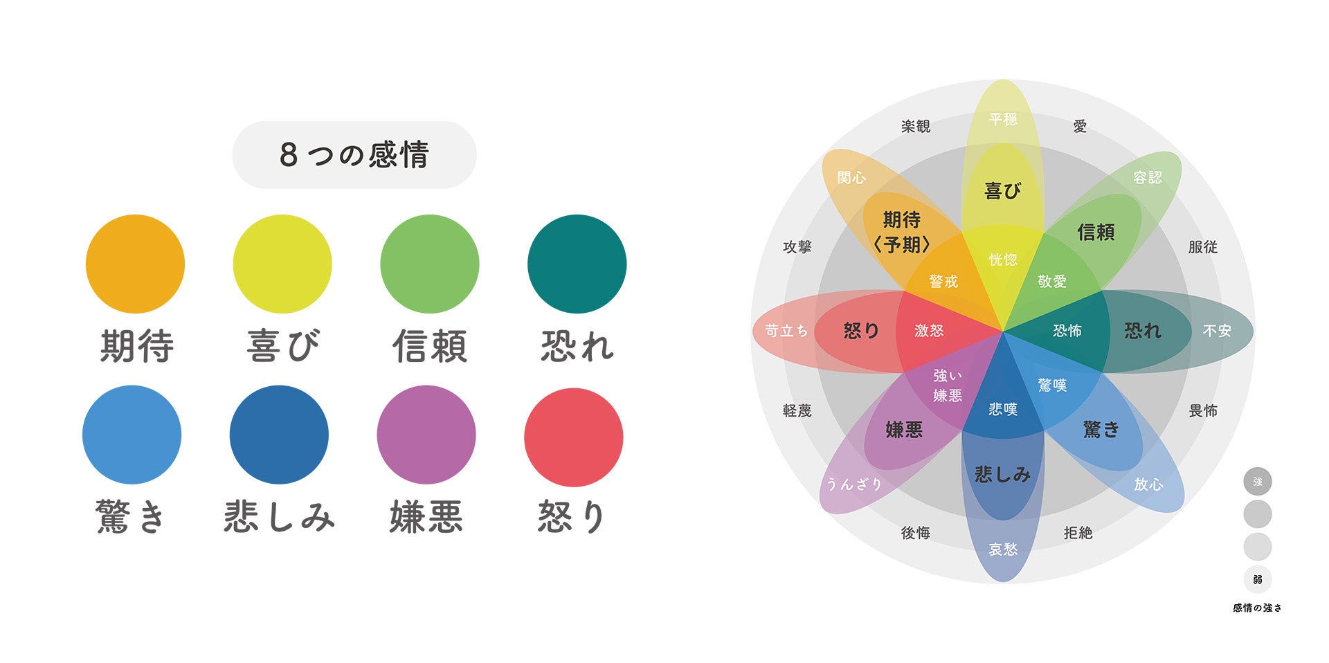 きもちのオノマトペカードはプルチックの感情の輪を背景理論として作られています。
