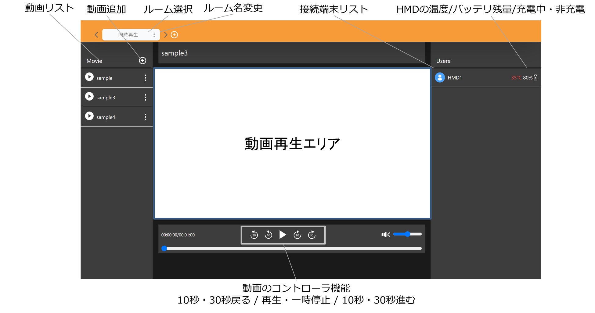 管理画面に接続している複数台のHMDに対して、管理画面から同時に同じ360度動画の選択・再生・停止・10秒/30秒送り/戻しなどの同時再生が可能です。