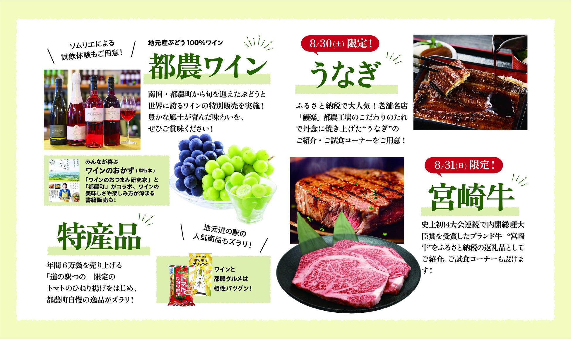 フェアでは、年間約70万人を集める道の駅つのから大人気の「トマトのひねり揚げ」をはじめ、自慢のお土産品を多数ご用意。ふるさと納税で大人気の「鰻」、「宮崎牛」の紹介、試食ブースも設け、農の都を感じられる空間を創出します。