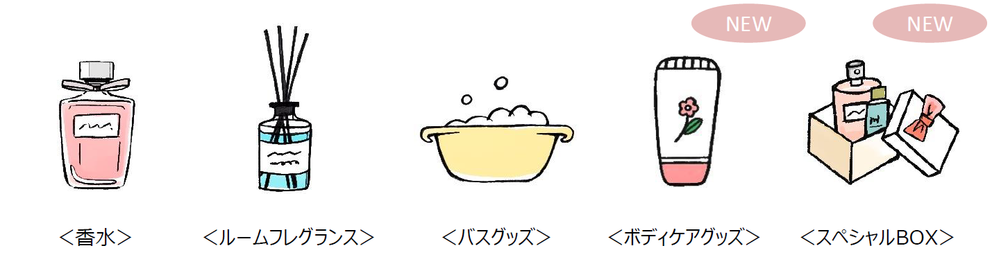 香水・ルームフレグランス・バスグッズに加え、5ジャンル展開中!