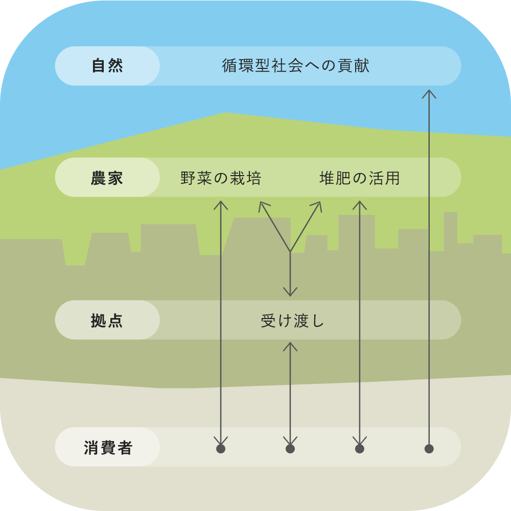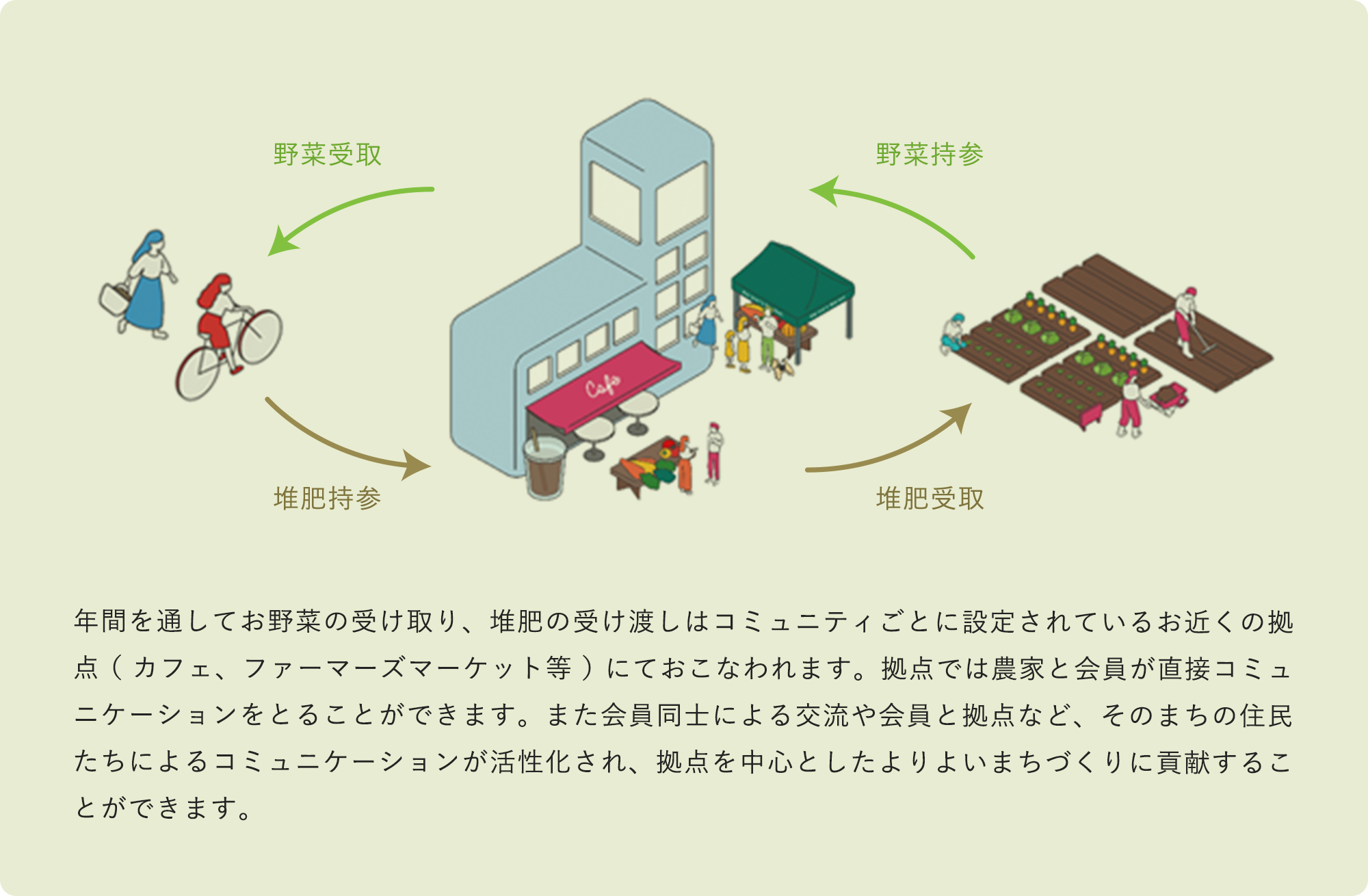 CSA LOOPを通して、堆肥の生産者であり野菜の消費者である会員、堆肥を有効活用し野菜を生産する農家、その野菜や堆肥の受け渡しがおこなわれる拠点、またそこのスタッフや常連など、関わる様々な人と人とのコミュニケーションを円滑にし、それによって生み出される有機的な関係性を最大化するためのプラットフォームの構築を目指しています。
