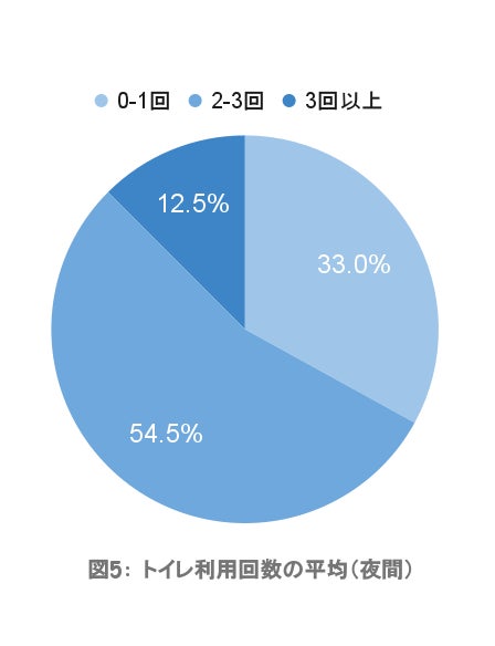 Tellusデバイスは、1日のトイレの利用回数、夜間のトイレの利用回数、トイレの滞在時間をモニタリングしています。ここでは、夜間のトイレの利用回数について分析しました。分析の結果、施設高齢者の約67%が夜10時から朝6時までの介護職員の手薄な時間に、トイレのために一晩に平均2回以上ベッドを離れている(図5を参照)ことが明らかになっています。