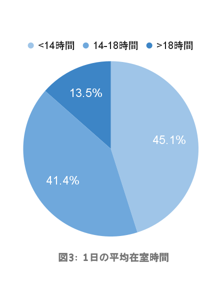 1日の在室時間及び在床時間について分析した結果、施設高齢者の14%が1日18時間以上を寝室で過ごし(図3を参照)、55%が1日14時間以上ベッド上で過ごしている(図4を参照)ことが明らかになりました。 新型コロナウイルスの制限が多く解除された現在でも、介護施設では、施設高齢者の行動がまだパンデミック前の社交レベルに戻っていないことが報告されています。