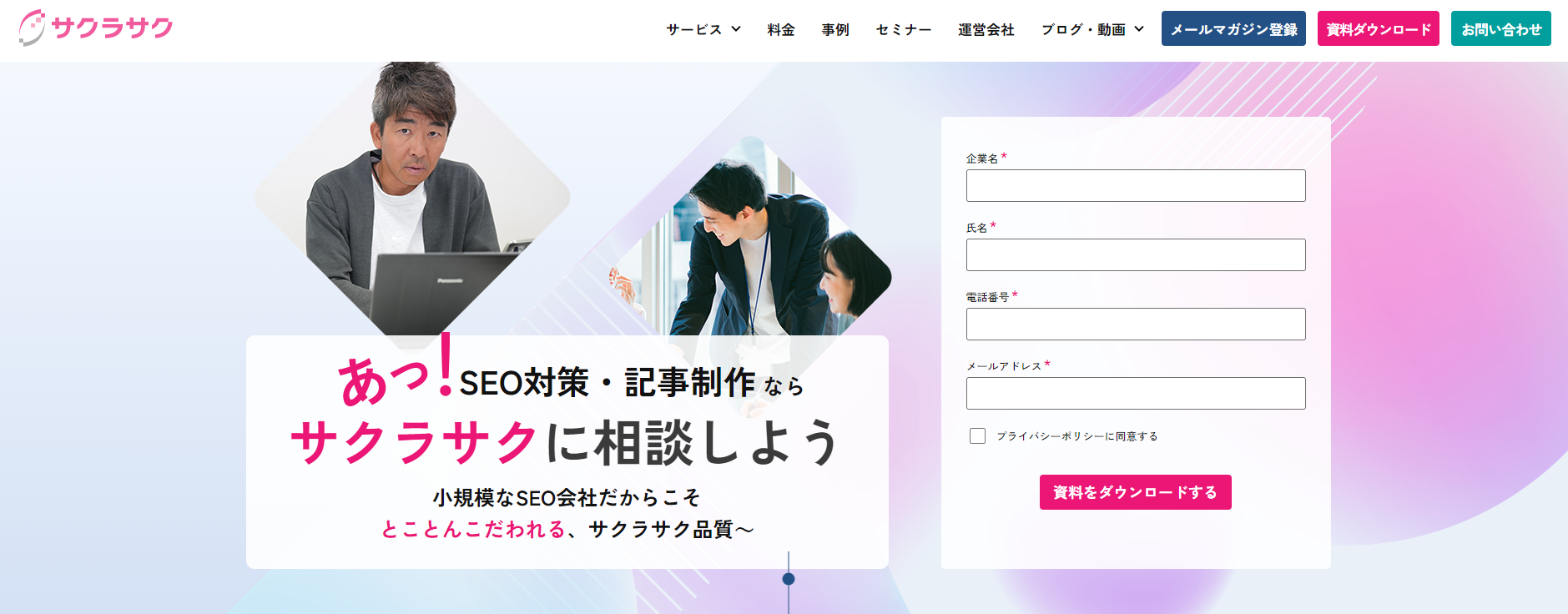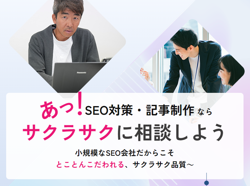 メインメッセージ:『あっ!SEO対策・記事制作ならサクラサクに相談しよう~小規模なSEO会社だからこそとことんこだわれる、サクラサク品質~』