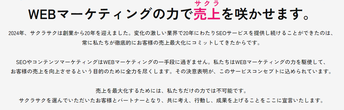 しかしながらSEOやコンテンツマーケティングはWEBマーケティングの一手段に過ぎません。私たちはWEBマーケティングの力を駆使して、今後さらにお客様の売上を向上させるという目的のために全力を尽くします。その決意表明が、このサービスコンセプトには込められています。