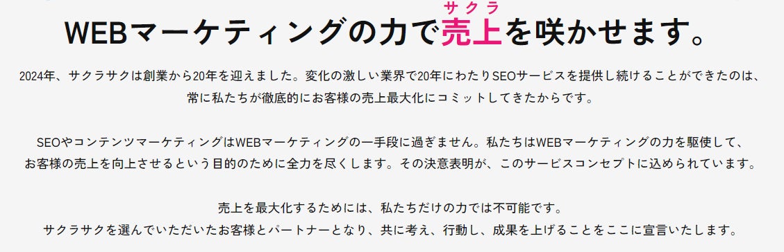 売上を最大化するためには、私たちだけの力では不可能です。サクラサクを選んでいただいたお客様とパートナーとなり、共に考え、行動し、成果を上げることをここに宣言いたします。