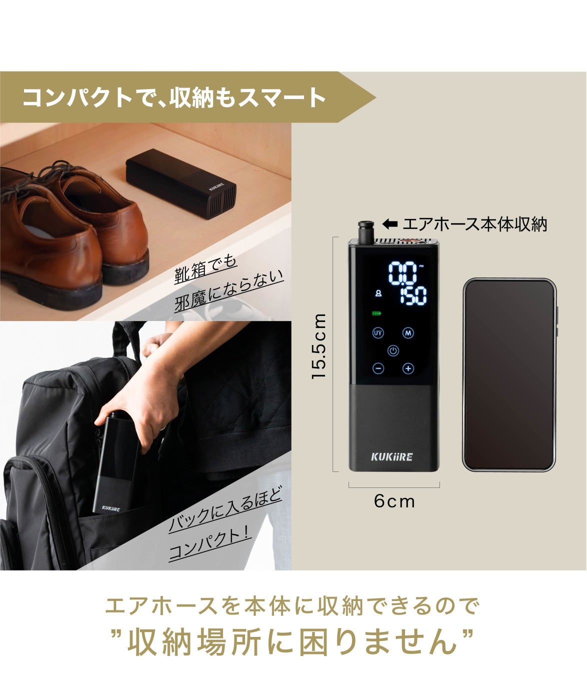 スマホよりも少し大きいサイズなので、靴箱に収納しても場所を取らず、コンパクトなので持ち運びにも便利で、自転車通勤の忙しい朝に空気入れを持ってマンションを往復することなく鞄へ入れて出社できます。