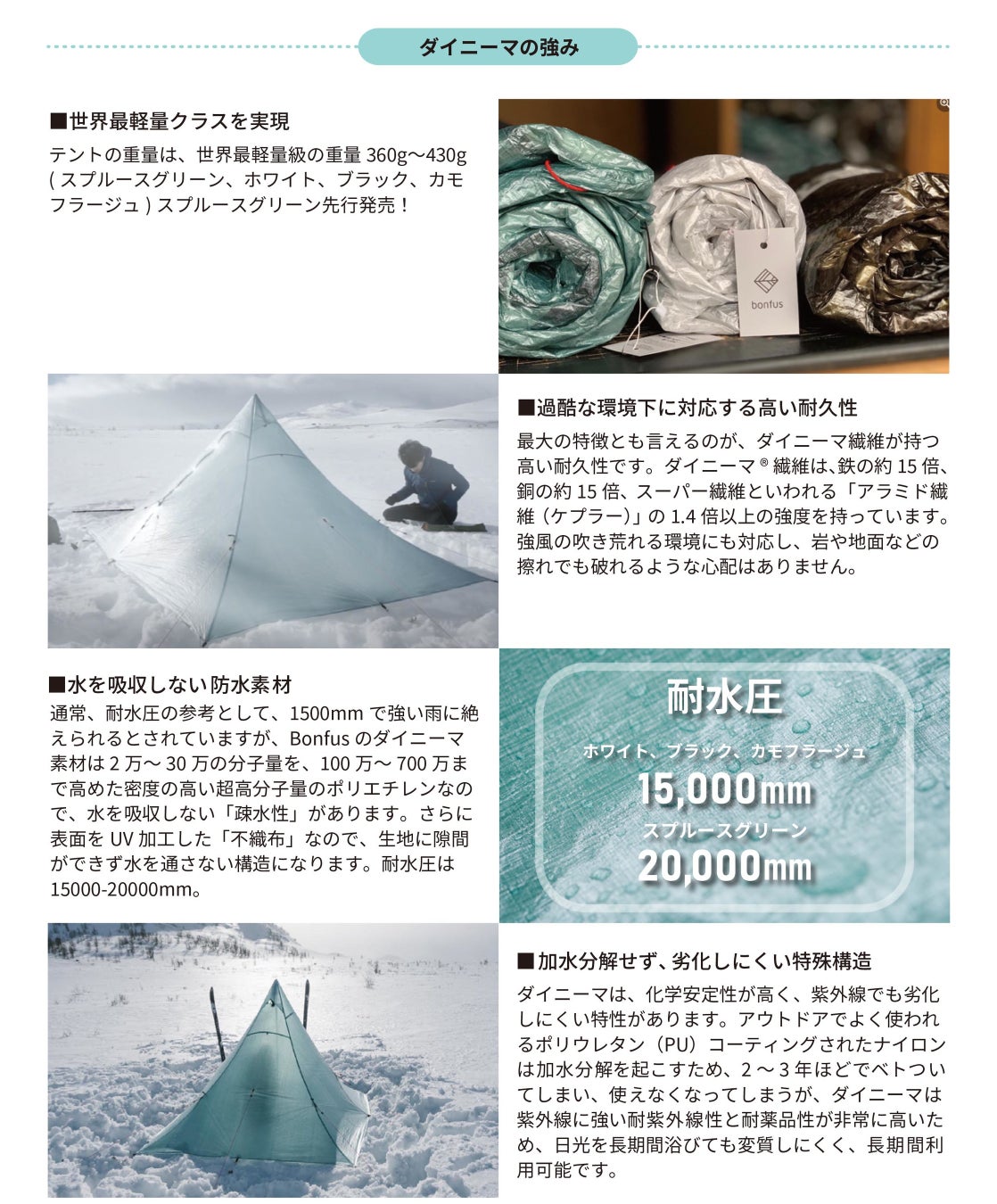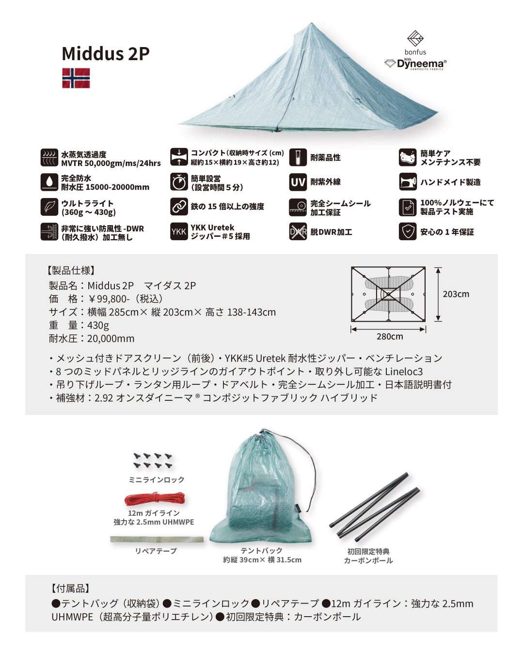リムルアウトドアジャパン合同会社ボンフェス事業部(以下略:ボンフェス)は、世界最強の繊維ダイニーマで作られた「マイダス2P」テントを2022年4月より順次発売します。