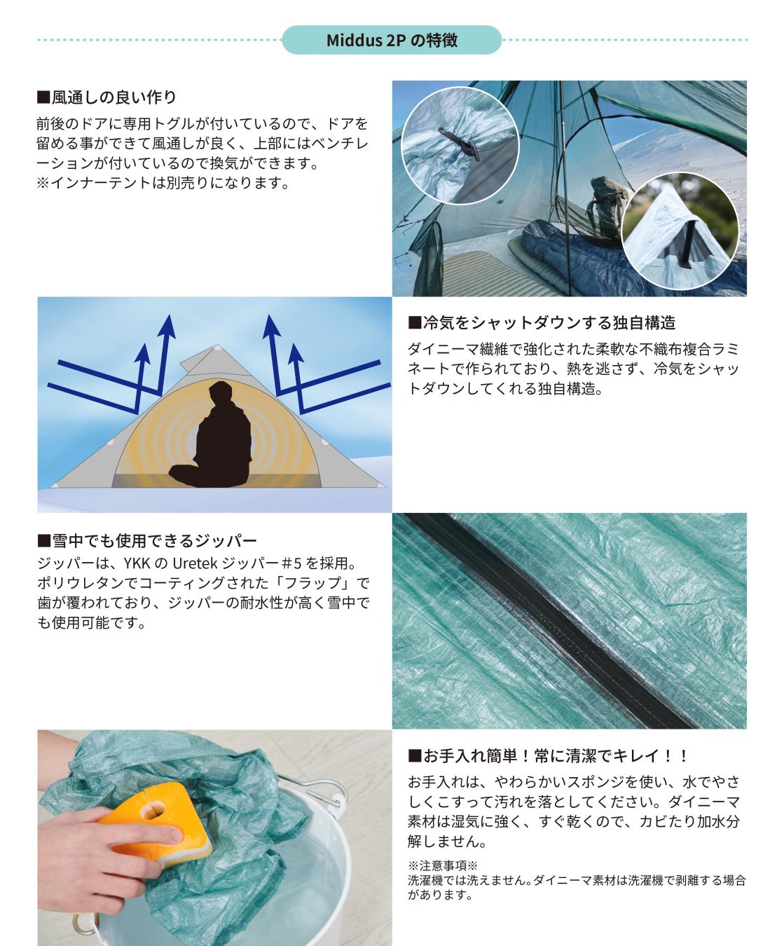 オールシーズン型のテントで広く使用されており、あらゆる天候で高い性能を発揮するほか、小さく丸めてコンパクトに収納できます。