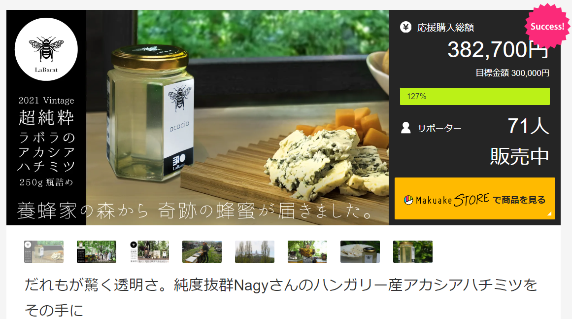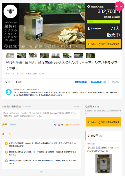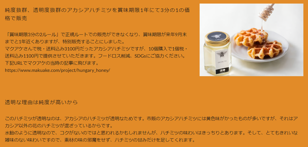 「賞味期限3分の2ルール」で正規ルート販売不能。マクアケ税・送料込み3100円のアカシアハチミツを10個1.1万円。ストアーズECサイトで販売開始、https://labarat.stores.jp/