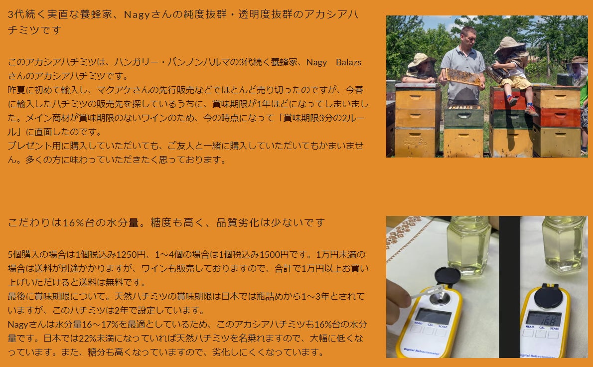 水分量をとことん減らし、糖分が高まったNagyさんのアカシアハチミツは品質的にはとても高いものと自負しています。ぜひ、素晴らしいアカシアハチミツの救済をよろしくお願い致します。