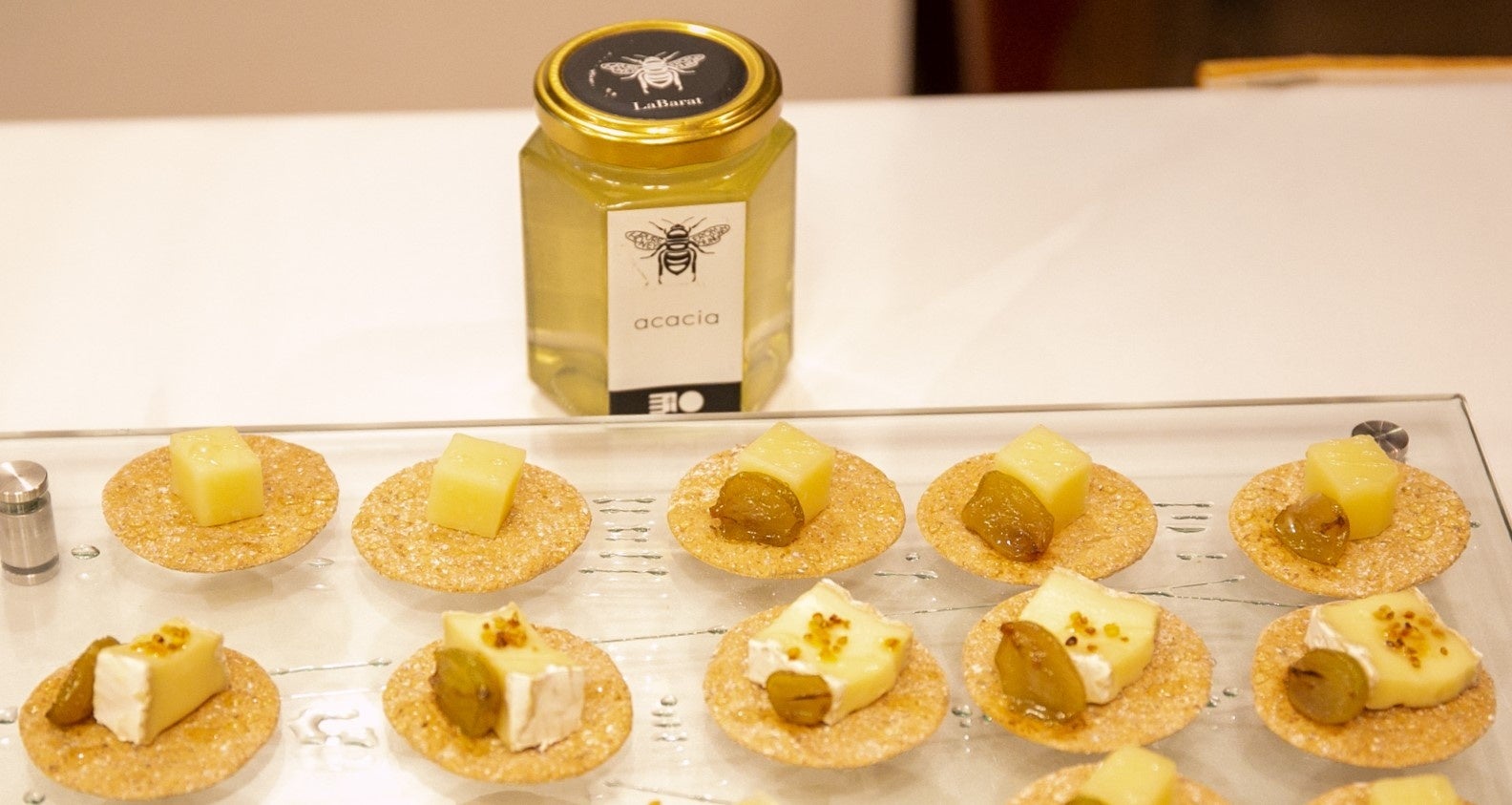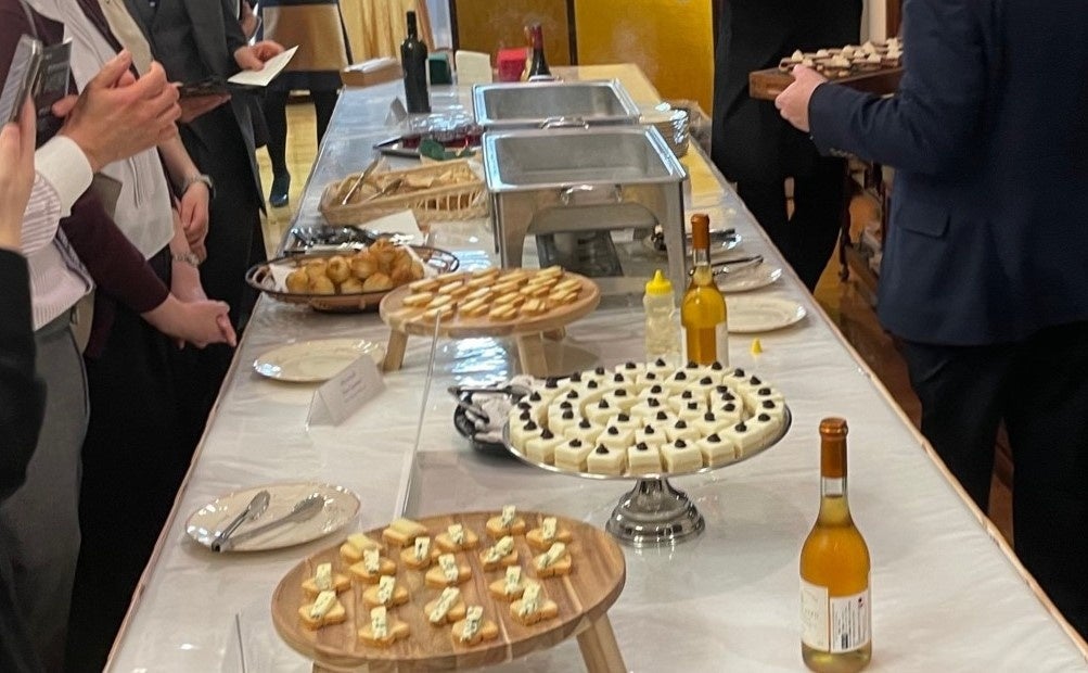 東京・三田の駐日ハンガリー大使館でこれまでに3度、ワインとのペアリングイベントやピアノイベントを行い、今回のハチミツをチーズに垂らした1品を毎回、極上トカイワインとともに味わっていただいています。