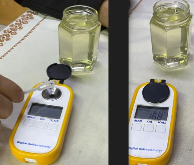 Nagyさんのハチミツの品質の高さを証明するのは純度だけではありません。水分と糖分も大事な要素です。日本では天然ハチミツの水分量は22%以下とされているのですが、Nagyさんは「16、17%が一番おいしい」として、巣箱のなかでミツバチが水分を飛ばすのを待ちます。下の写真はNagyさんのご自宅を訪ねて、輸入するハチミツの水分量を測ってもらっている様子ですが、16.8%と表示されています。