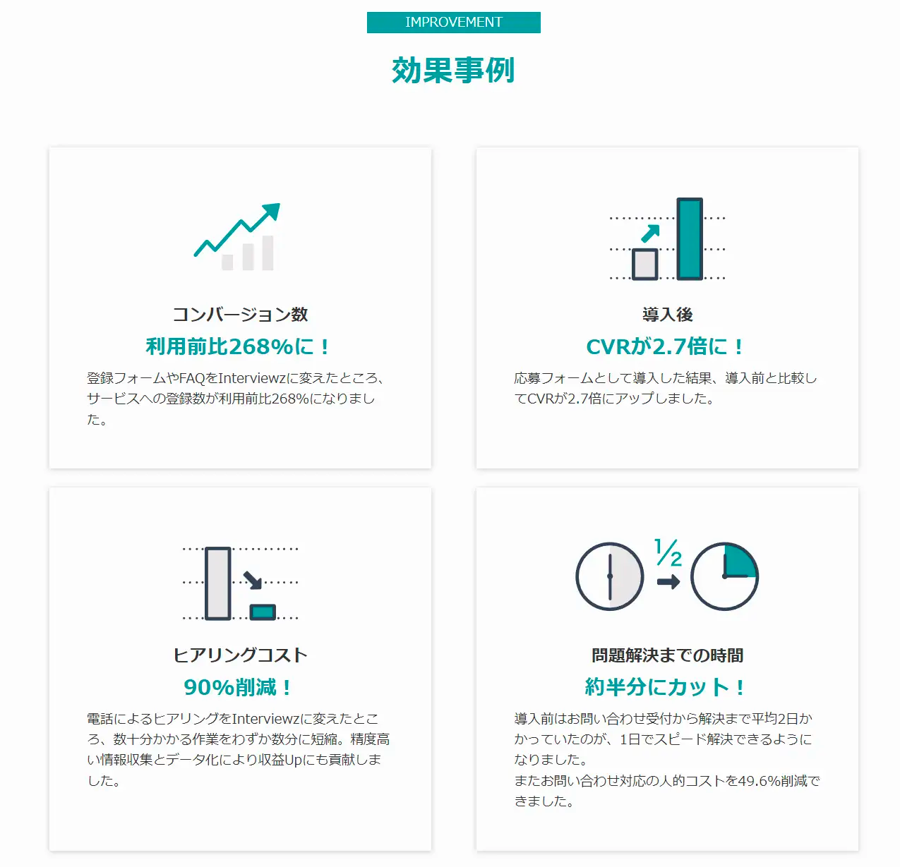 お問い合わせ数268%改善、ヒアリングコスト90%削減、サポート解決時間半減など、あらゆるビジネスプロセスで業界問わず利用実績多数。