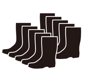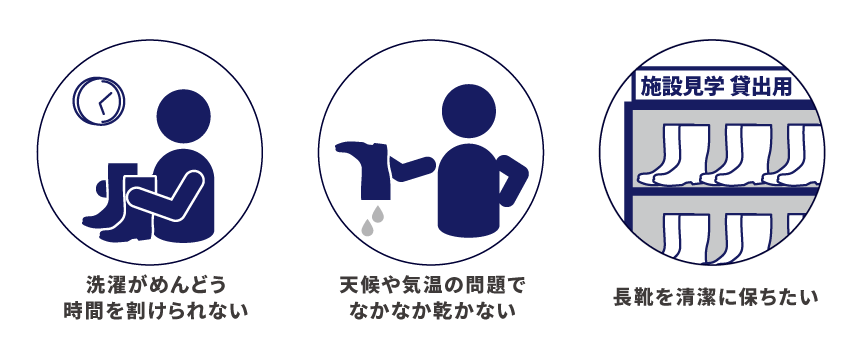 長靴を洗う作業は、一足ずつ洗う「手間」、乾かすための「時間」や「場所」が必要となります。