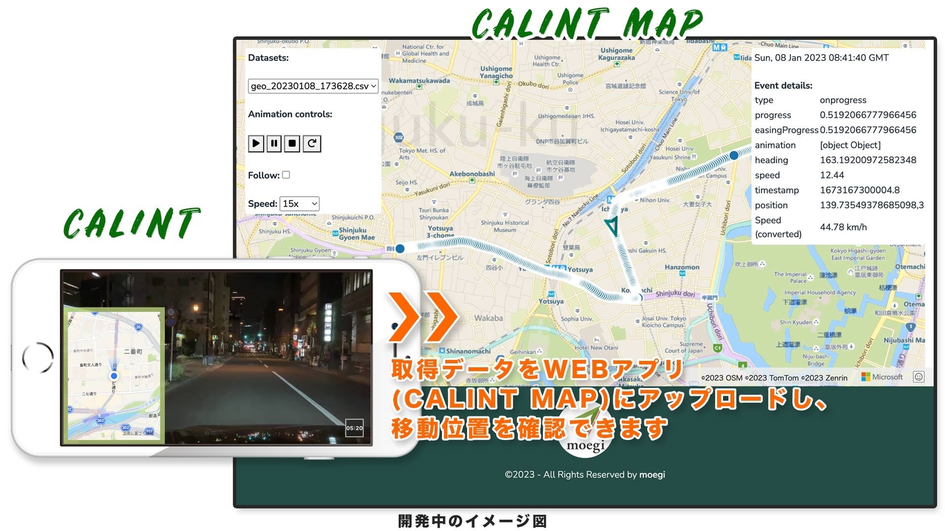 移動データを可視化しながら一元化するサービスは少なく、moegiが管理・運営するCALINTアプリでは、今後ますます増加する位置情報に関連する地図データを企業や自治体などが効率的かつ有効に利用できるようにするため、地図データ処理技術に特化したWEBアプリの開発を行っています。