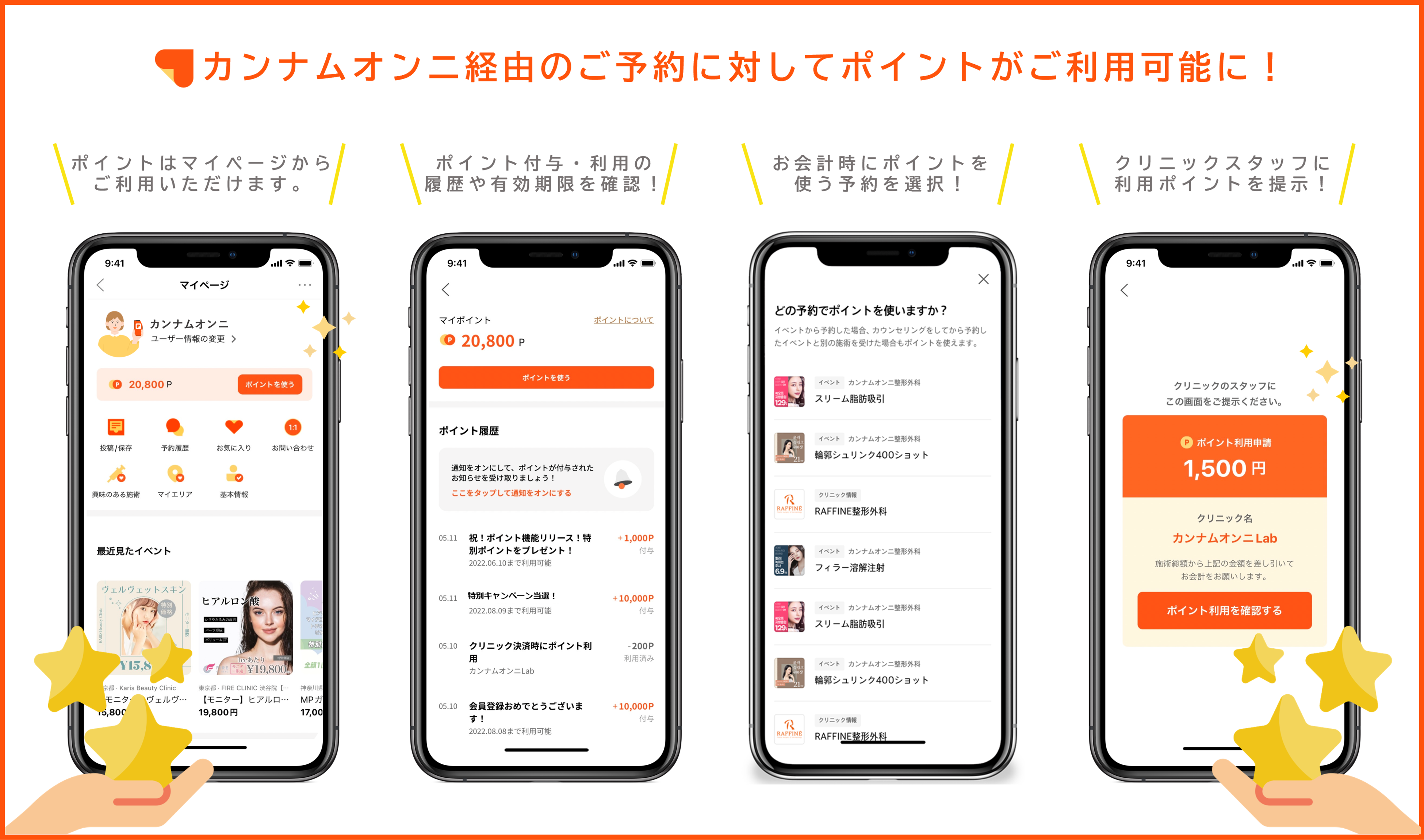 これまで特にユーザーより強いご要望を頂いていたポイント機能をリリースしました。アプリ内で貯めたポイントは、カンナムオンニ経由でご予約いただいた施術・手術の決済時に、クリニックにて1pt=1円としてご利用いただけます。主なポイント付与機能は以下の通りです。是非この機会にご利用ください。