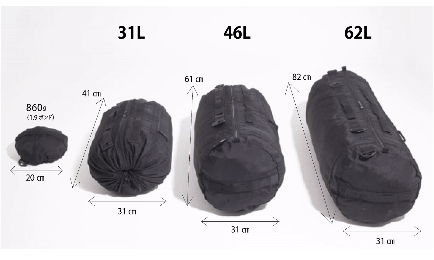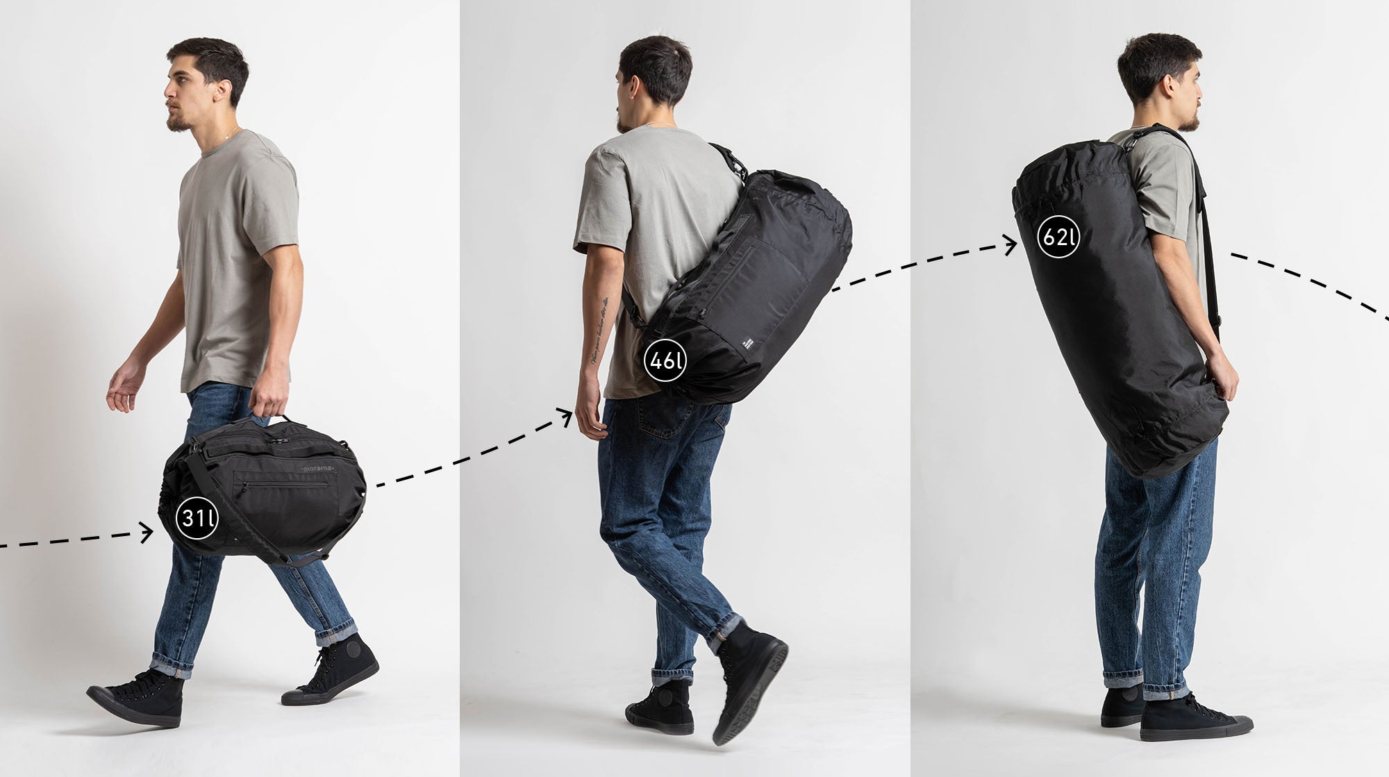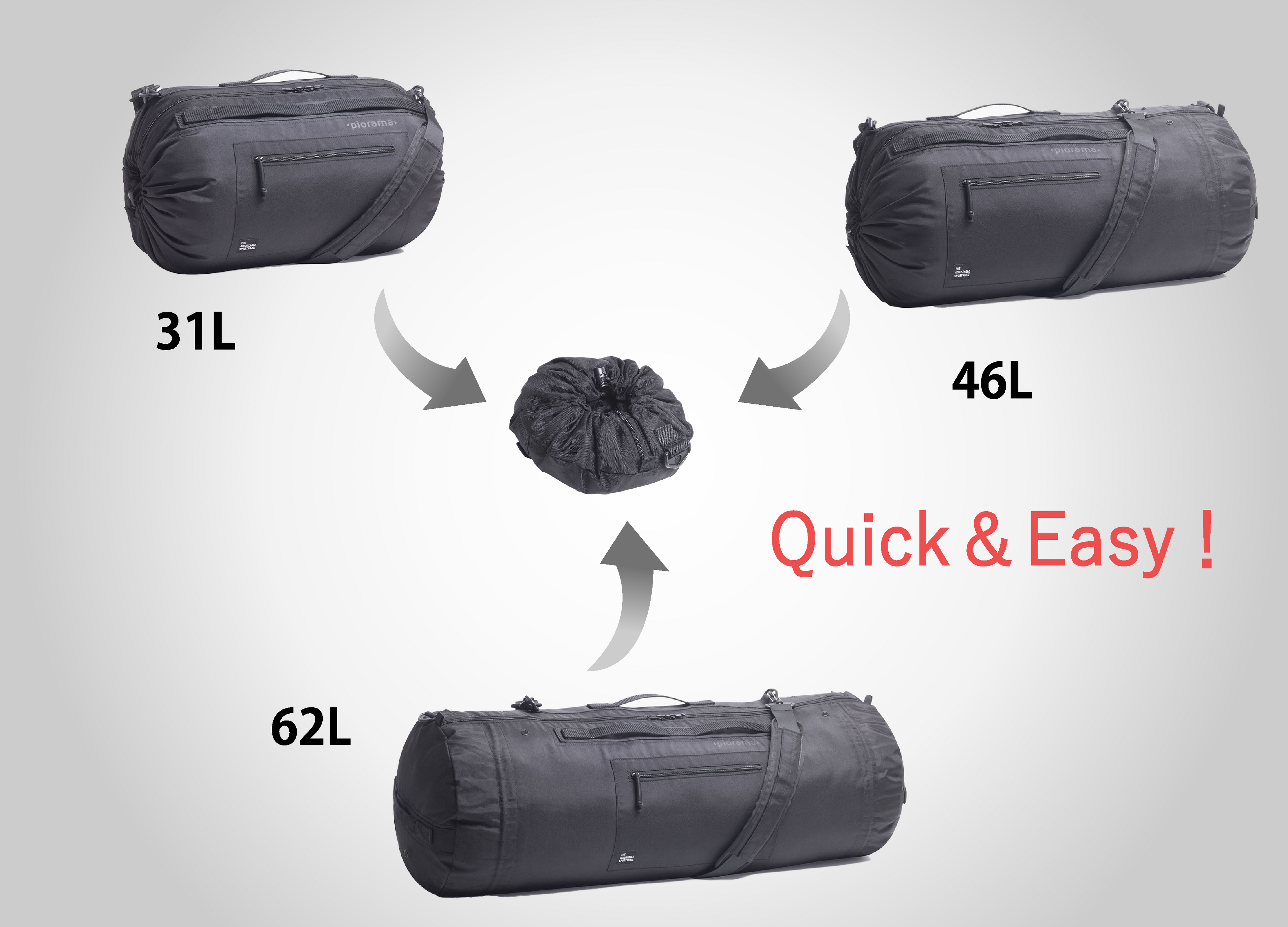 この1つのバッグで3つのサイズに拡張。最大62Lの大容量アジャスタブルバッグ