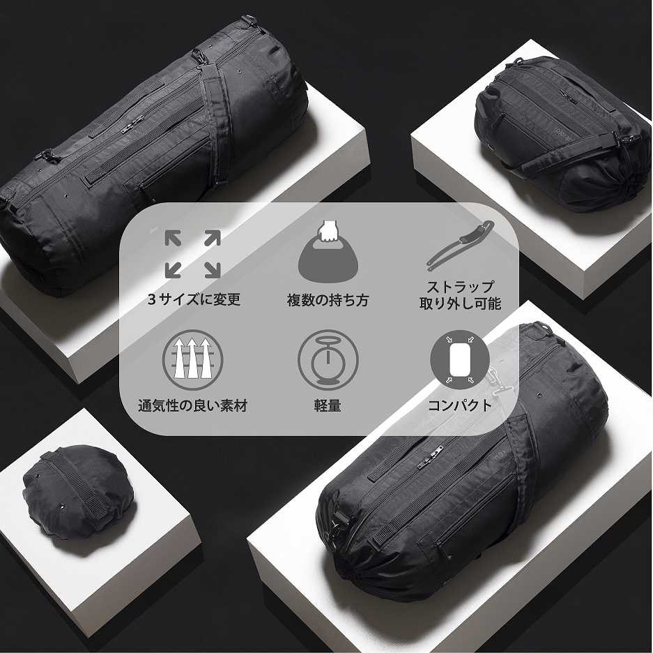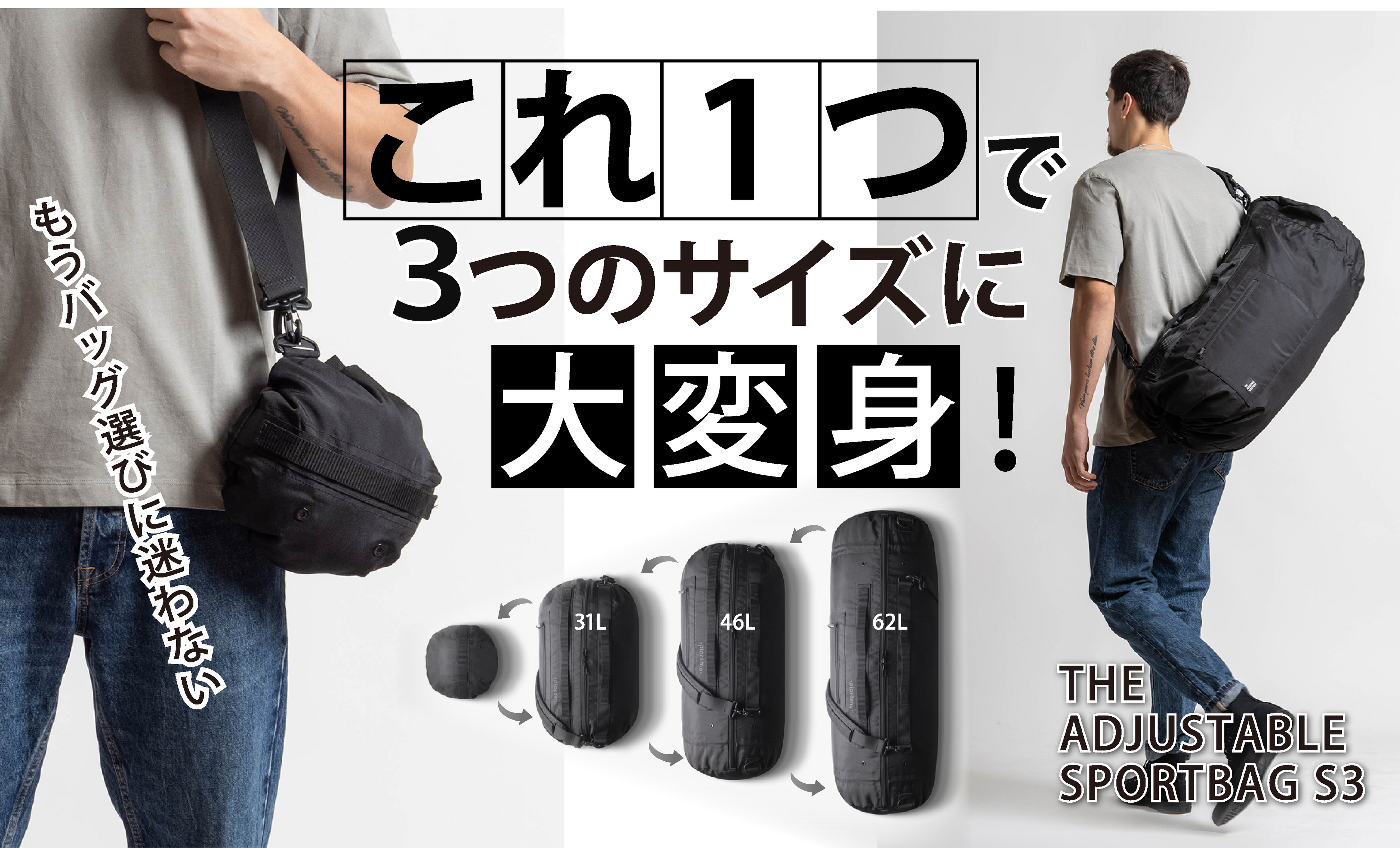 アジャスタブルバッグは、あらゆるニーズに対応する革新的バッグです。31L・46L・62Lの3つのサイズ間でバッグ拡張ができ、必要なときに追加スペースを作ることができます。ありそうでなかった斬新なバッグ。自由自在にカスタマイズ !これさえあればお出かけ前のバッグ選びに時間を費やすことがありません。さあ、アジャスタブルバッグを持って、今日も出かけよう!