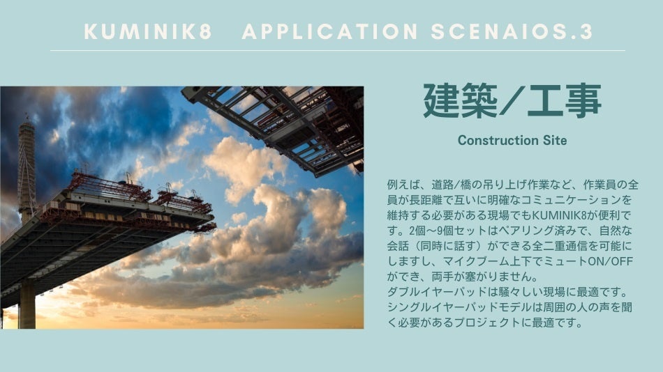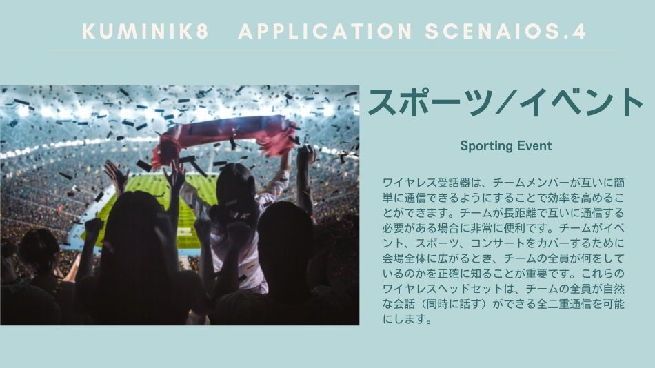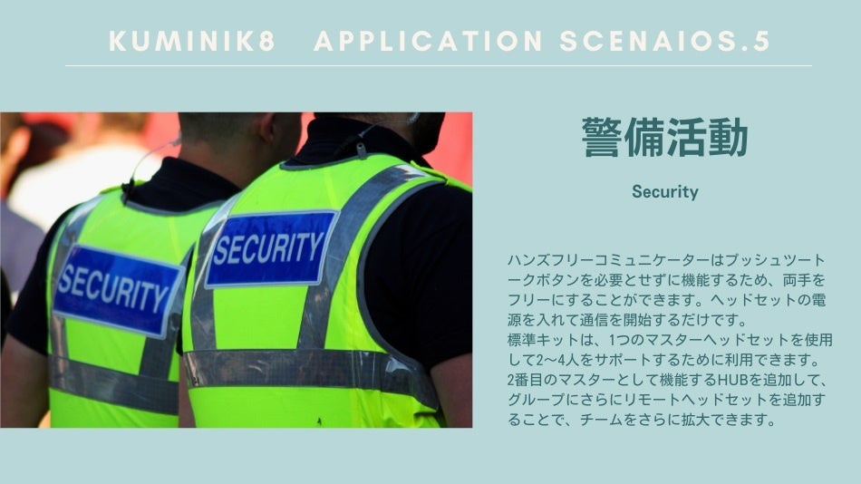 映画撮影、ドローン撮影、建築・工事現場、スポーツ、イベント、警備活動などの現場でメンバー同士間のコミュニケーションを取るには最適なソリューションです。親子機間最大450m全二重通信、マイク上下でミュートON/OFF、ペアリング済み、収納ケース付き。技適認証・PSEマーク取得。2022年5月下旬メーカー出荷開始予定です。
