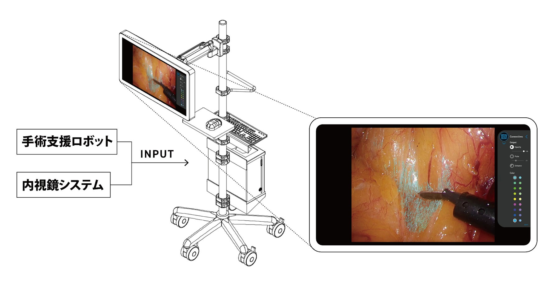 「Eureka α」は、手術用の内視鏡システムや手術支援ロボットから受けた映像信号を解析し、術者が通常確認するモニターとは異なるサブモニター上に疎性結合組織をリアルタイムに強調表示することで外科医の視覚認識を支援するプログラム医療機器です。疎性結合組織とは、臓器と臓器の間に存在する繊維状の構造物であり、がん等の手術における切除ラインの目印となる重要な構造物です。熟練医は、適切な緊張をかけることにより、疎性結合組織を露出しながら手術を進めます。この、疎性結合組織を露出し、剥離していく手技は世界で共通していますが、日本において特に発展しており、Eureka αは繊細な手術を行う日本だからこそ開発できた技術ということが出来ます。