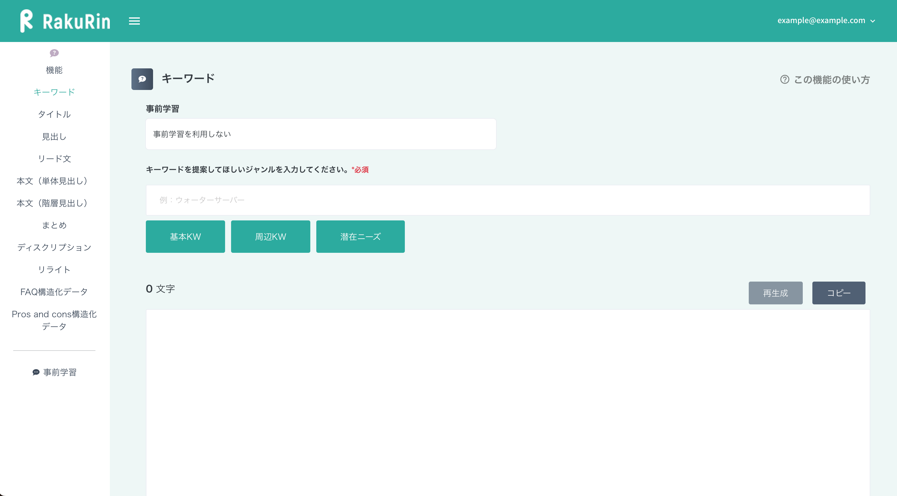 ラクリンは「事前学習機能」をそなえ、「柔らかい文章」「『!』や『?』を使う」「専門性が高い内容はわかりやすく」など、自身の文章の雰囲気に近いものを設定できます。生成したい文章の雰囲気を事前学習できるので、手直しの回数や頻度を最小限に抑えられます。
