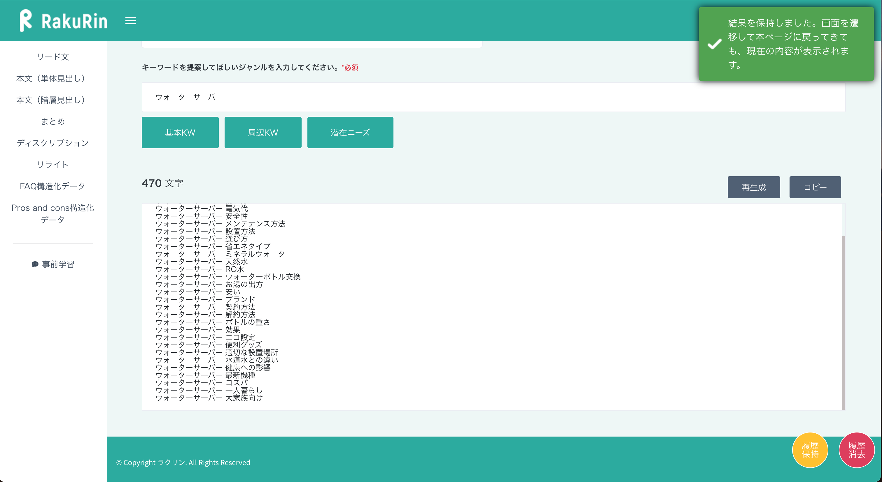 「履歴保持」では直近の生成結果を画面上にキープでき、誤操作でリロードしたり、他の機能を使ってから再度戻ってきても結果を残せるので便利にお使いいただけます。生成結果に人の手を編集を加えたのちに履歴保持ボタンを押すと上書き保存されるので、生成から編集までひと画面で完結します。