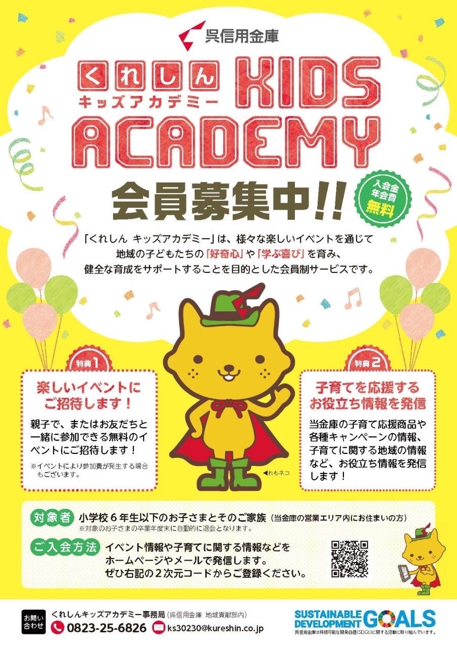 呉信用金庫(本店:広島県呉市、理事長:向井 淳滋)では、中小企業の発展や、地域のみなさまの豊かな暮らしの実現に向けて取り組むため「呉信用金庫SDGs宣言」を掲げています。❝暮らしやすい街づくり❞への取組みの一環として、今般、小学生以下のお子さま(および保護者さま)を対象とした会員組織『くれしんキッズアカデミー』を創設しました。