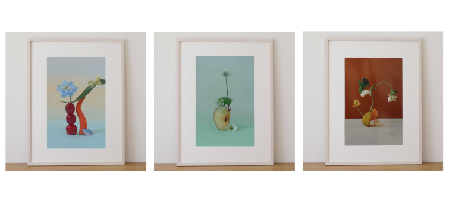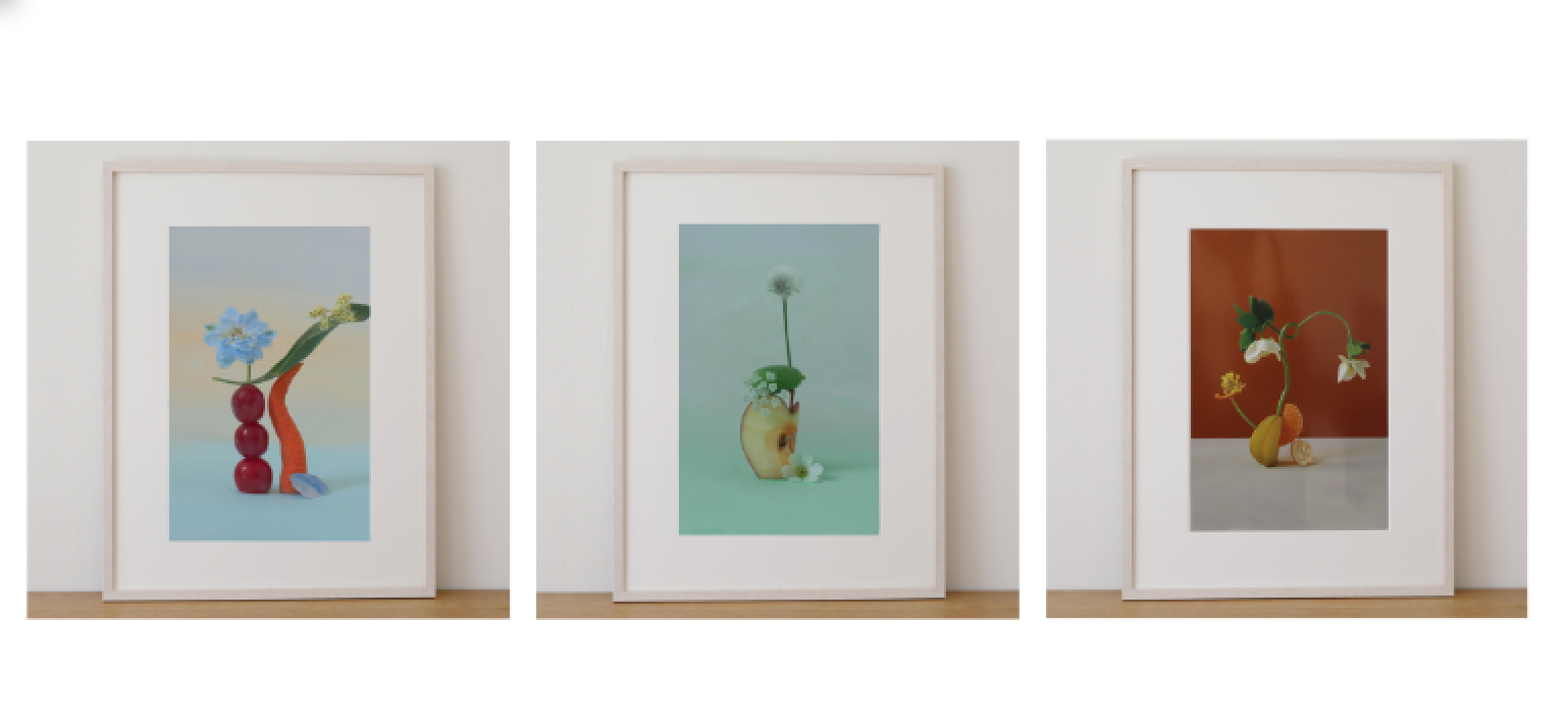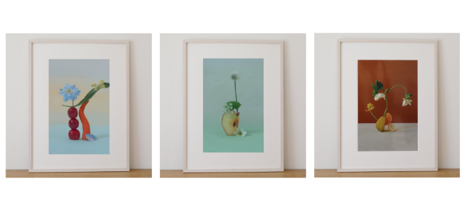 彼女は、「素材に声を与える」ように、花や果物、ガラス製品などあらゆるものを使い、色とりどりの背景と連動させながら作品を作り上げていきます。
