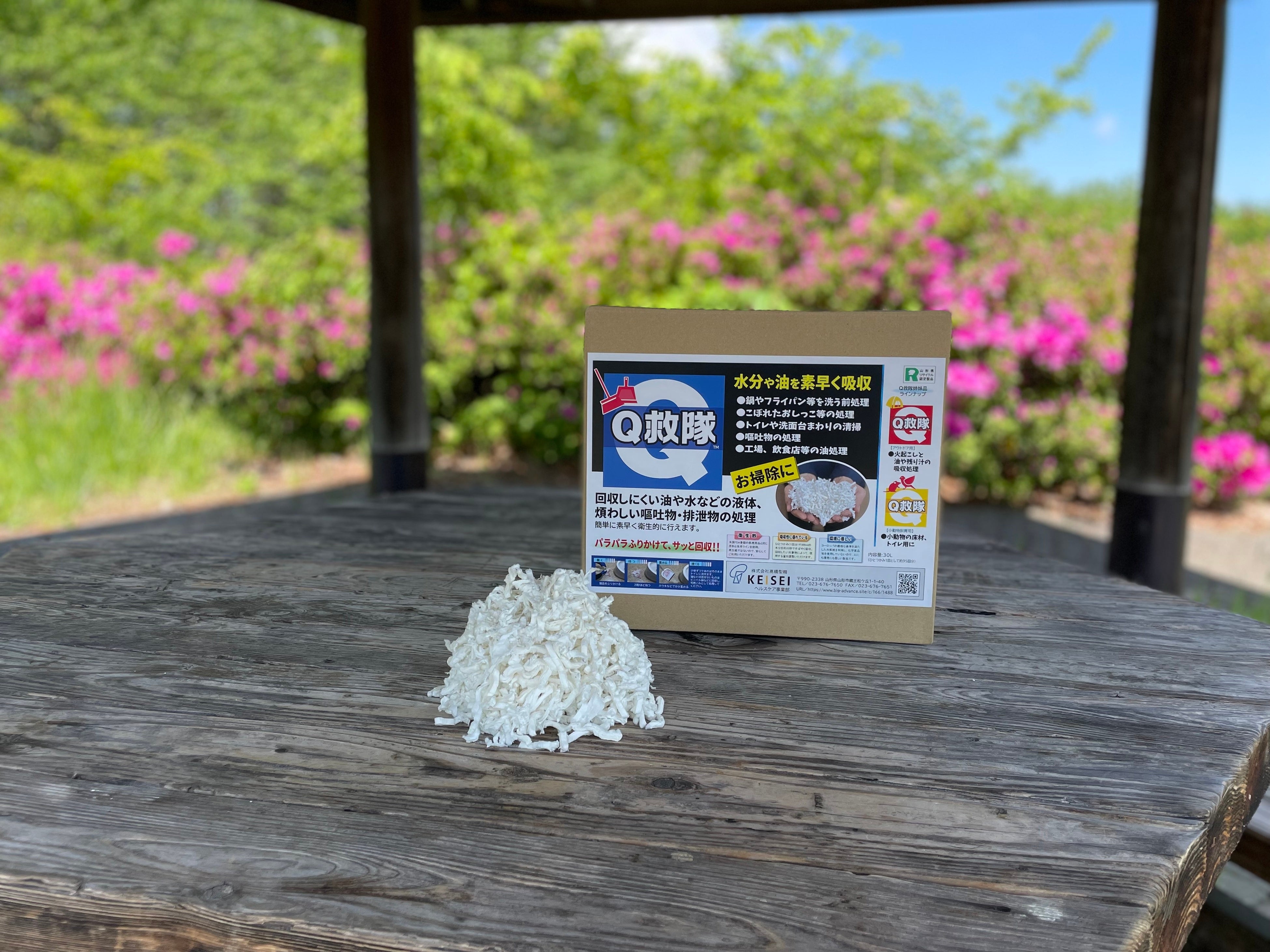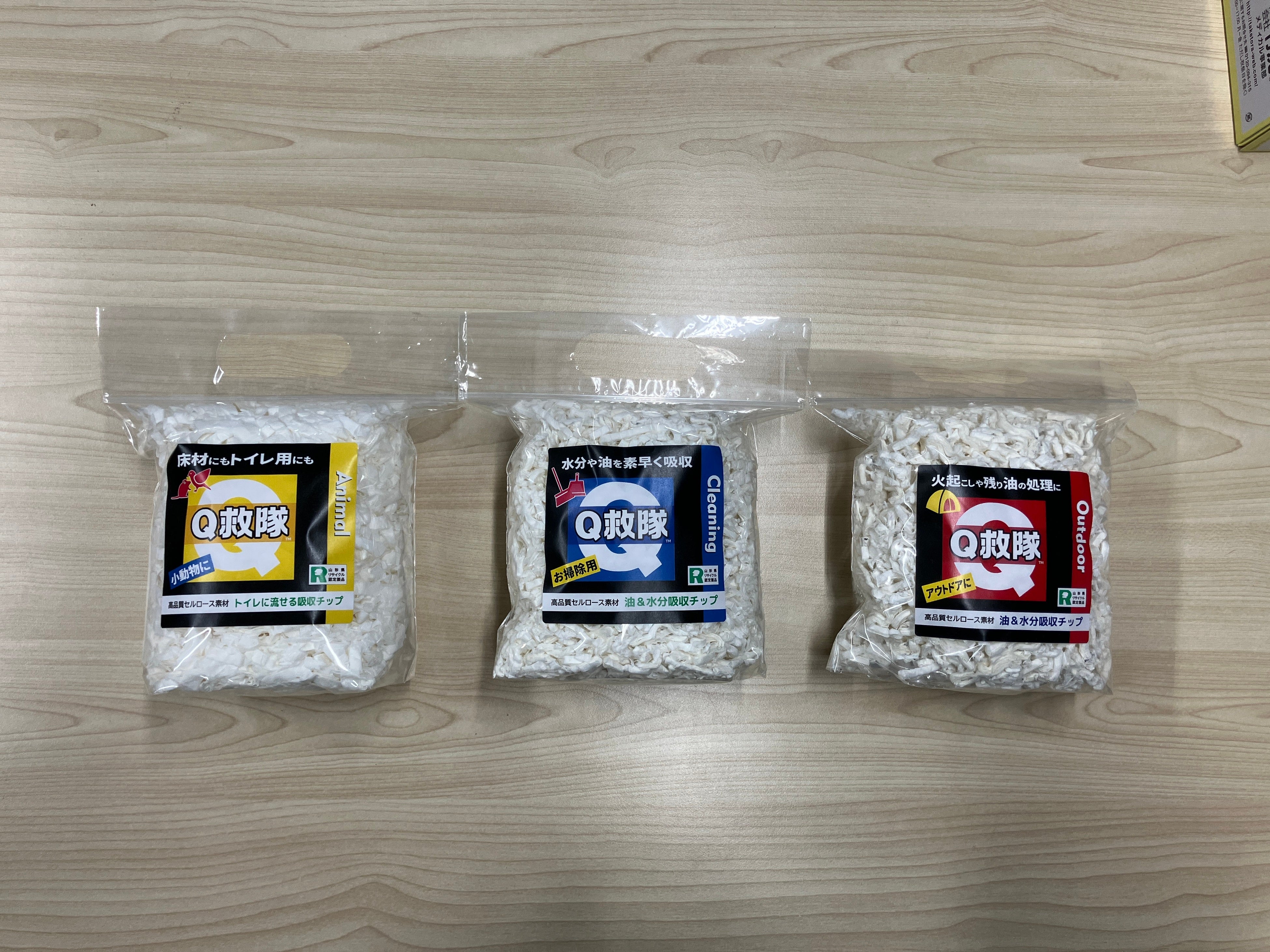 山形県リサイクル認定製品「Q救隊」は、医療用原料の生産ラインで生まれた紙の端材を再利用した、環境に優しいリサイクル製品です。高い吸収力で、こぼれた水分や油、処理に困る嘔吐物や排泄物などを素早く衛生的に処理できるだけでなく、アウトドアでの火起こしや残り汁の処理、小動物の床材など様々な用途でご活用頂いています。現在本製品は、3種の用途別パッケージで展開中です。