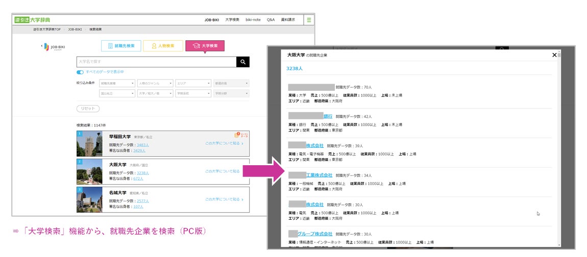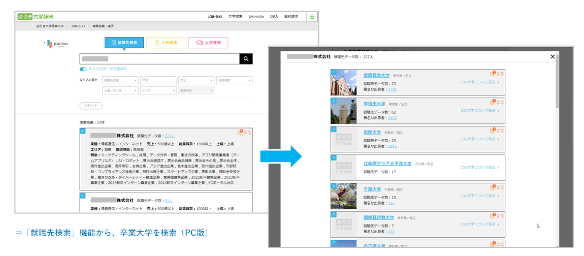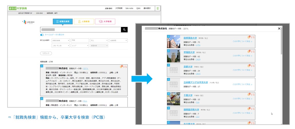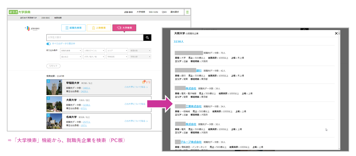 内容:就職先企業や職業などから出身大学を検索出来る新サービス
