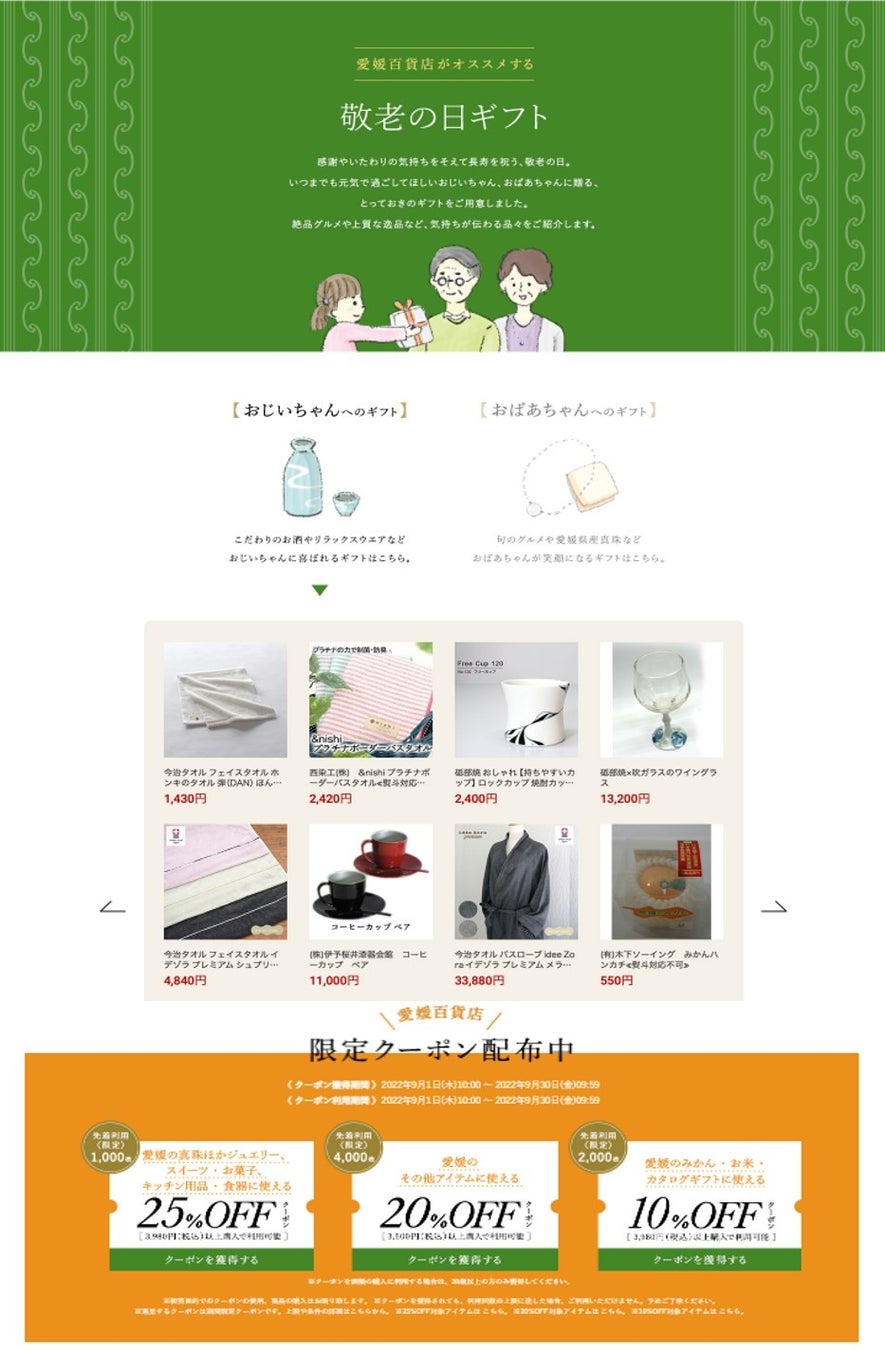 ・内容:キャンペーン特典:愛媛百貨店と共通で利用できるクーポンをご用意しております。※一部のクーポンはご利用できません。