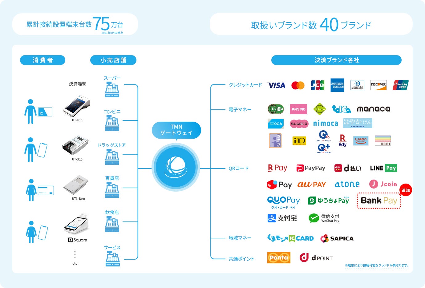 政府が掲げる「2025年までにキャッシュレス決済比率40%」の目標に向けて、キャッシュレス決済利用が拡大傾向にあるなか、キャッシュレス決済手段も広がり、消費者のニーズも多様化しています。TMNは小売店舗の多岐にわたる決済手段の管理や運用負担軽減のため、店舗と各決済ブランド事業者をつなぐクラウド型決済ゲートウェイサービス「TMNゲートウェイ」を提供しております。店舗は「TMNゲートウェイ」を利用することで、ワンストップで複数の決済手段と多数の決済ブランドを導入できるほか、導入後のブランド追加や機能拡張も容易なため、消費者の多様なキャッシュレスニーズに対し、素早く応えることができます。
