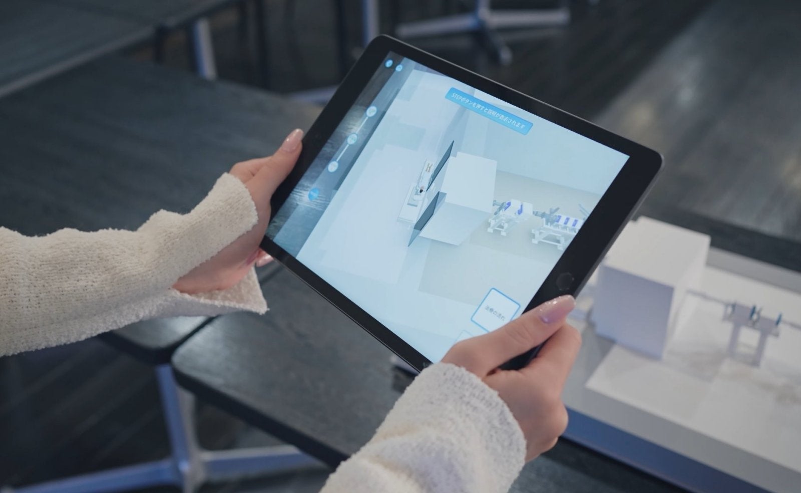 実物の製品「NeuCure®」は数メートルのサイズがございますが、模型は卓上サイズのコンパクトな仕様となっております。AR システムを組み込む事で、模型にタブレット (Apple iPad) をかざすと機器の動作や機能を確認したり、実物サイズなども体験することができるようになりました。模型と AR の両方を利用することで表現の幅が広がっています。