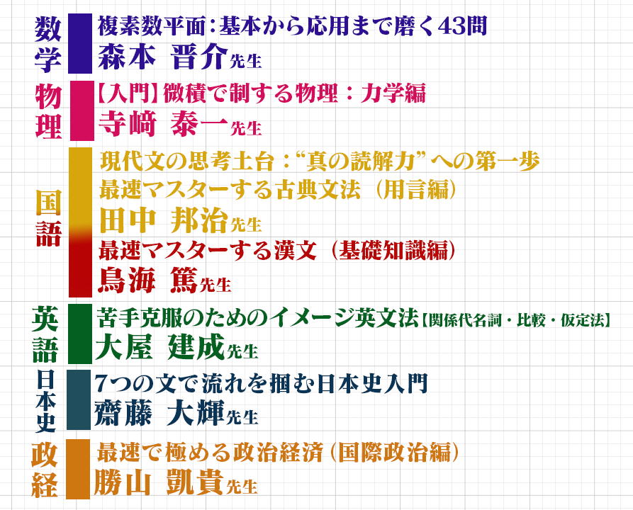 ゼロから全ての大学入試に通用するカリキュラムを作成。これから高校での授業に取り組む方から、受験勉強に向けた本格的な学習を始める方まで全ての人が対象全ての講座でカリキュラムを事前に公開。
