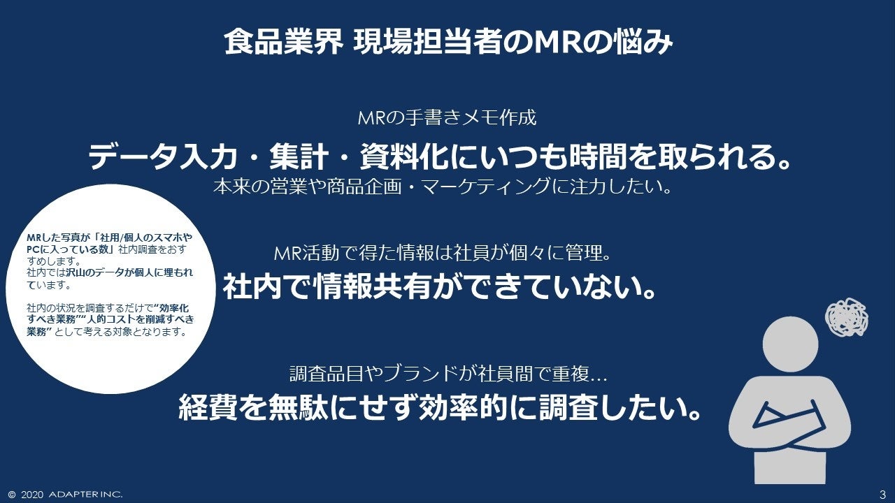 また、これまでの自主MRデータは、個人個人が写真データや計量調査、喫食感想をスマートフォンや個人のパソコンで管理しているため資料化されないデータは、企業にとって埋もれたデータとなっているのが現状です。