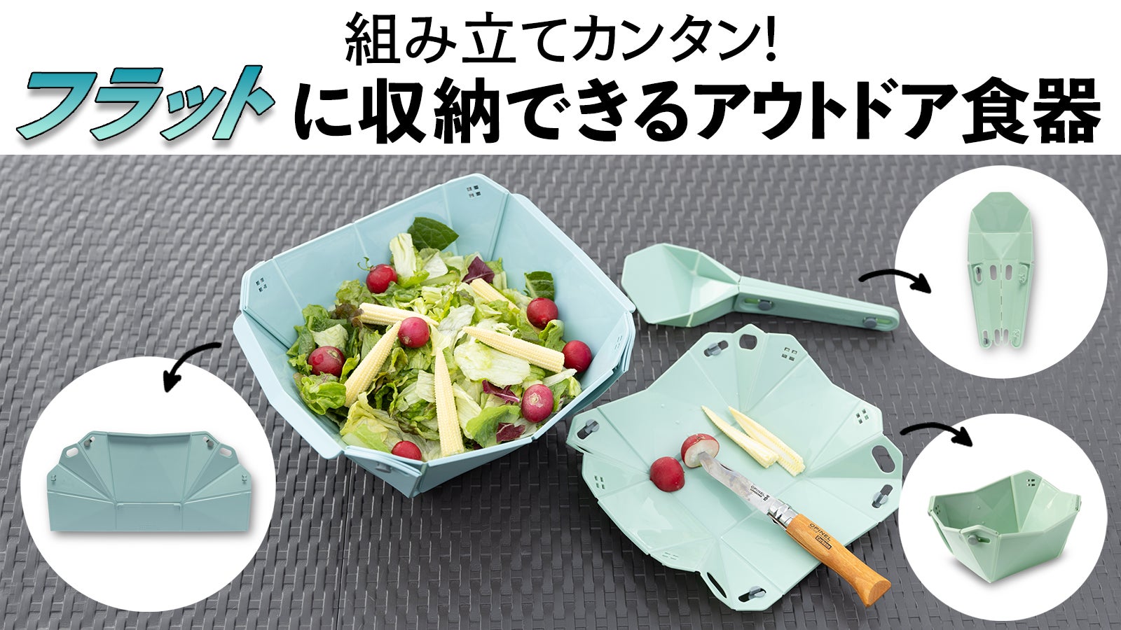 パッと組み立て!フラットに収納できるアウトドア食器、応援購入サービス「Makuake」にて先行販売開始