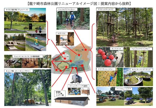 長年市民に愛されてきた龍ケ崎市森林公園を再生し、アウトドア・アクティビティ施設で新たなにぎわいの場を創出。