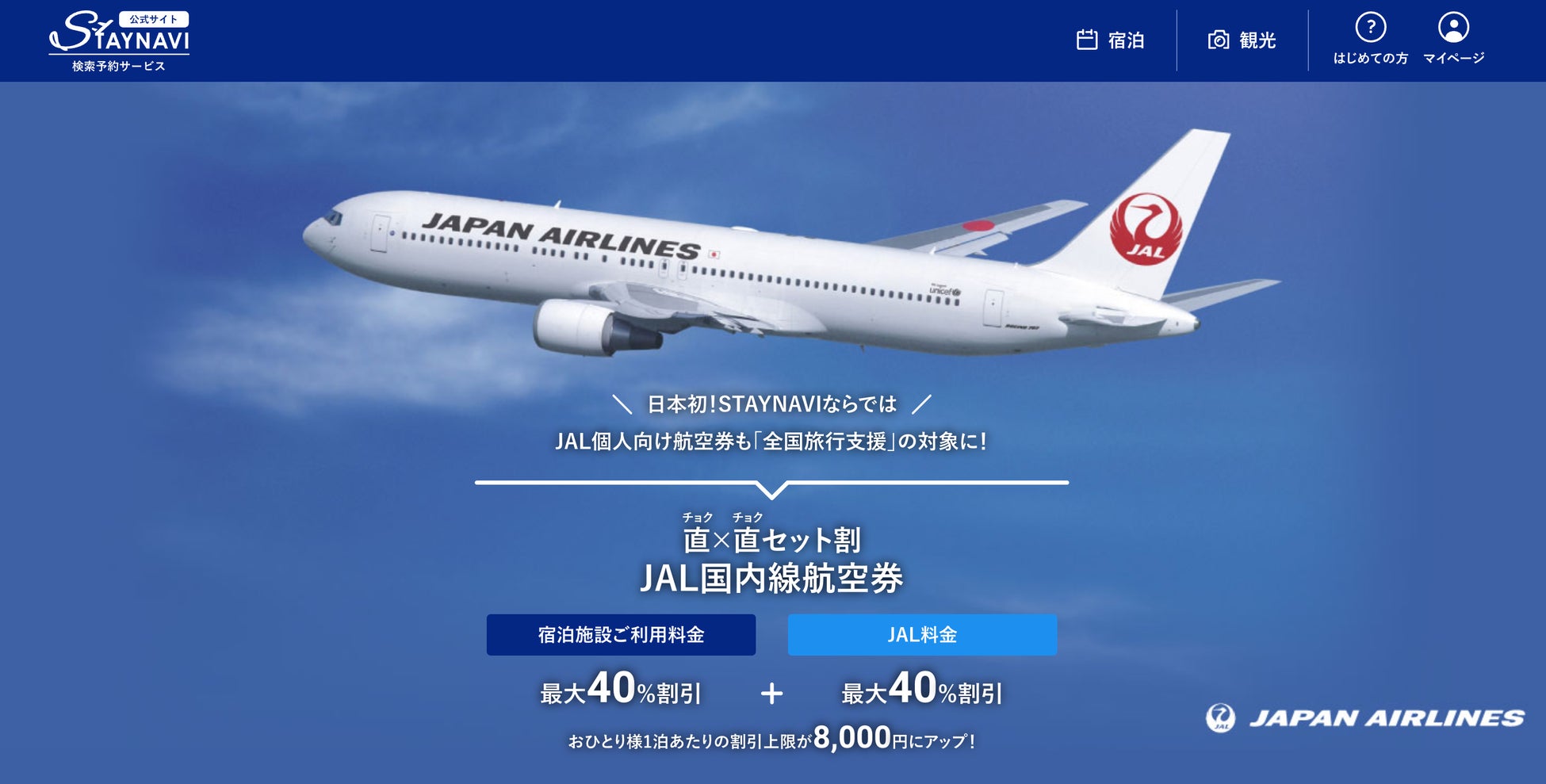 STAYNAVI®︎「直×直セット割」の割引申込を10月22日から正式に受付開始!直販の宿泊とJALの個人向け航空券が「全国旅行支援」で最大40%割引に!