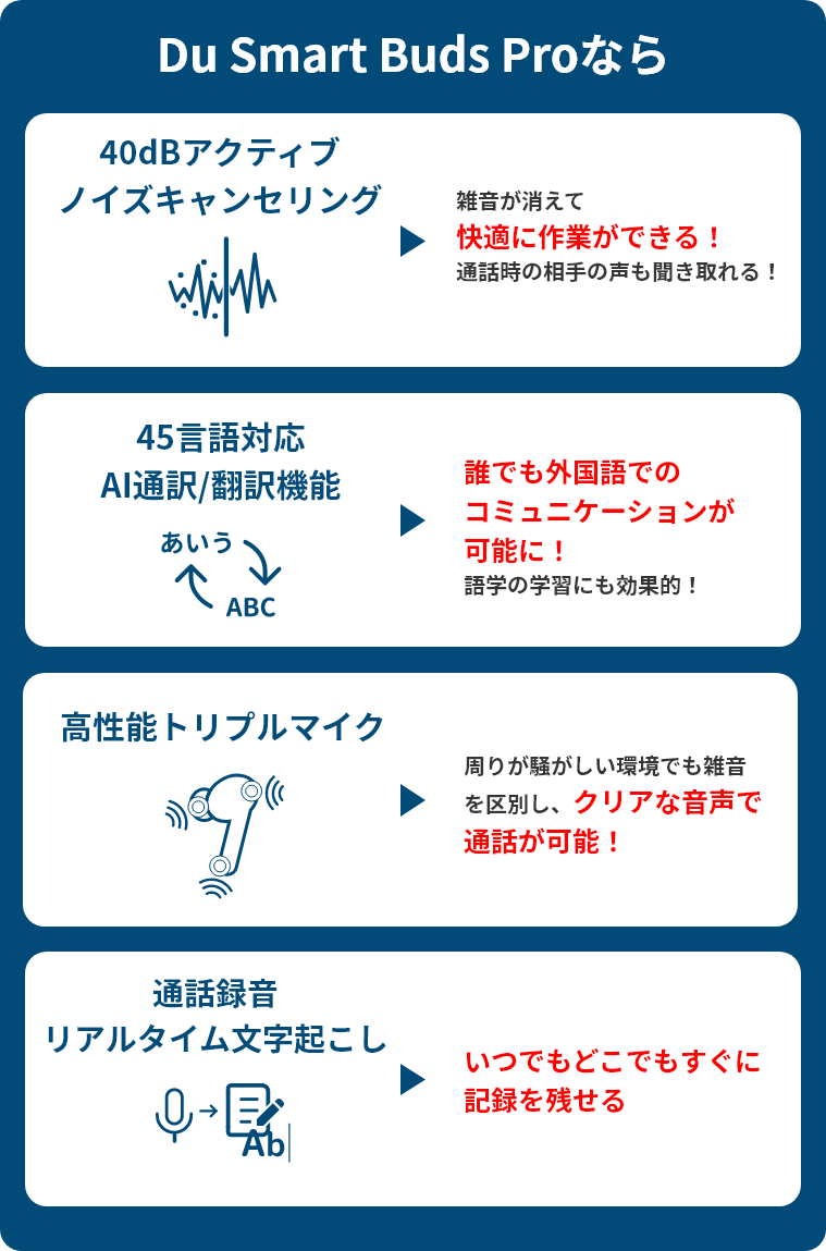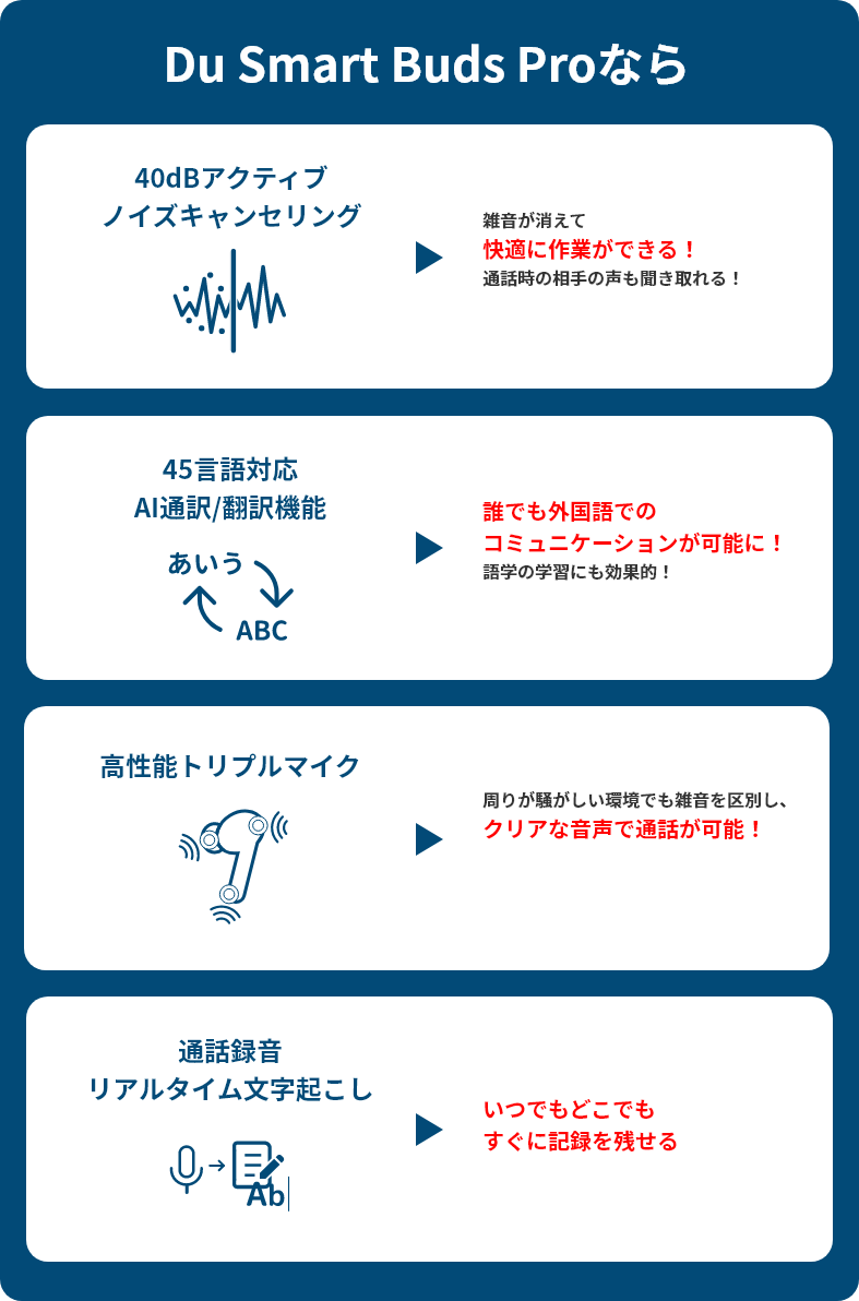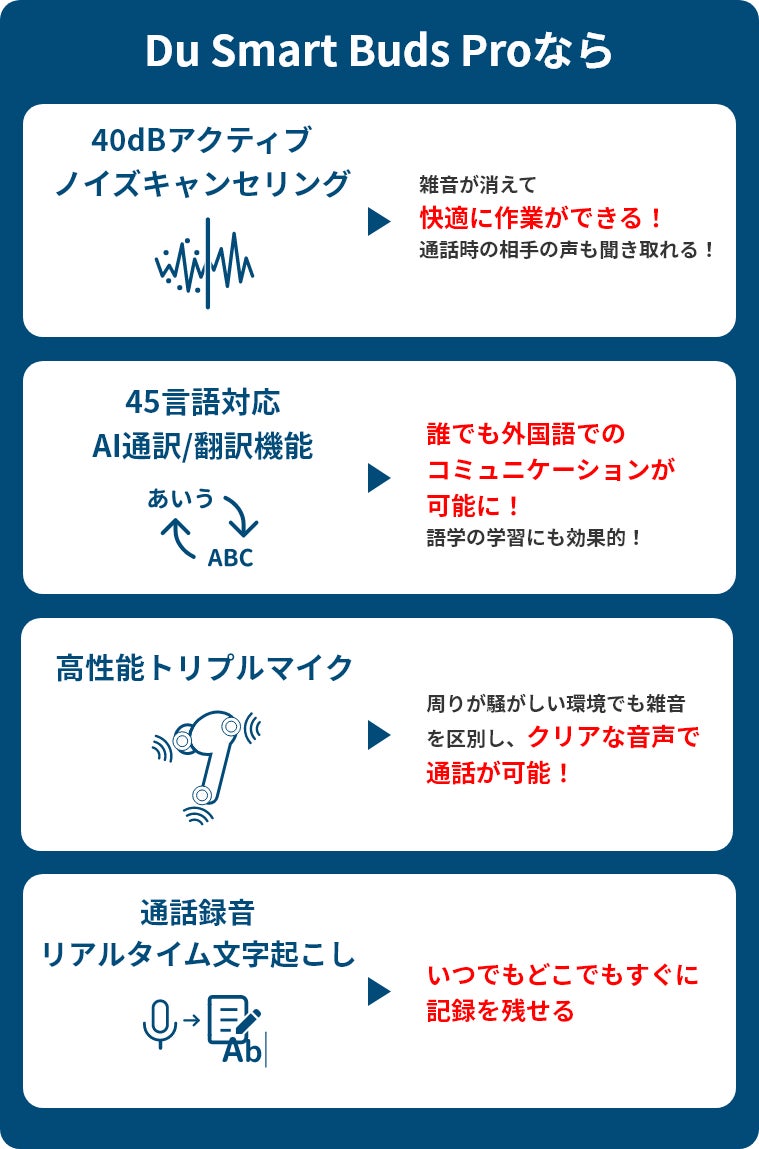 リモートワークが進む中、仕事や作業、WEB会議の際に周りの音が気になり集中できないことはありませんか?また、海外の方との打ち合わせ時に会話に入れず、困った経験はありませんか?そんなお悩みを解決するために、開発されたのが「Du Smart Buds Pro」です。