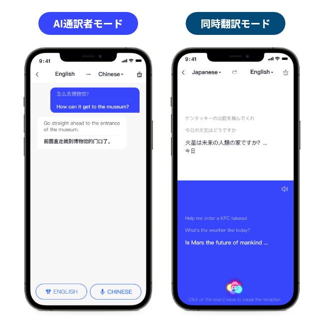 ①チャット形式でリアルタイムの会話を通訳する「AI通訳者モード」