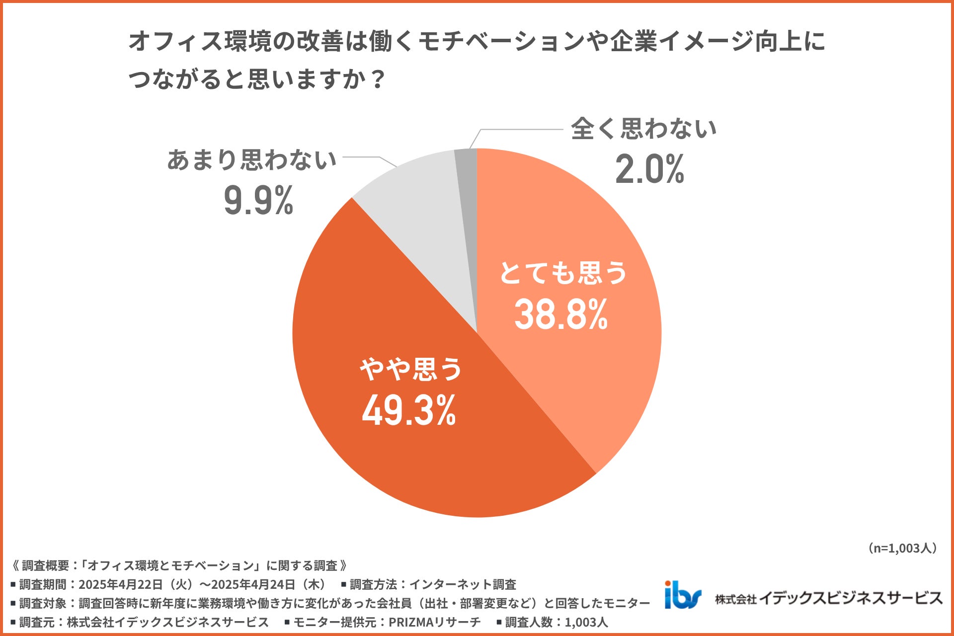 再び全員に、「オフィス環境の改善は働くモチベーションや企業イメージ向上につながると思うか」について尋ねたところ、約9割の方が『とても思う(38.8%)』『やや思う(49.3%)』と回答しました。