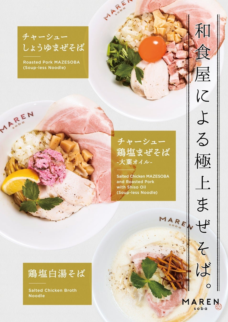 約2年の間に、3店舗を抱えるブランドに成長させ、今年4月1日ついに初のFC(フランチャイズ)となる「soba MAREN 肥後橋店」がオープンいたします。