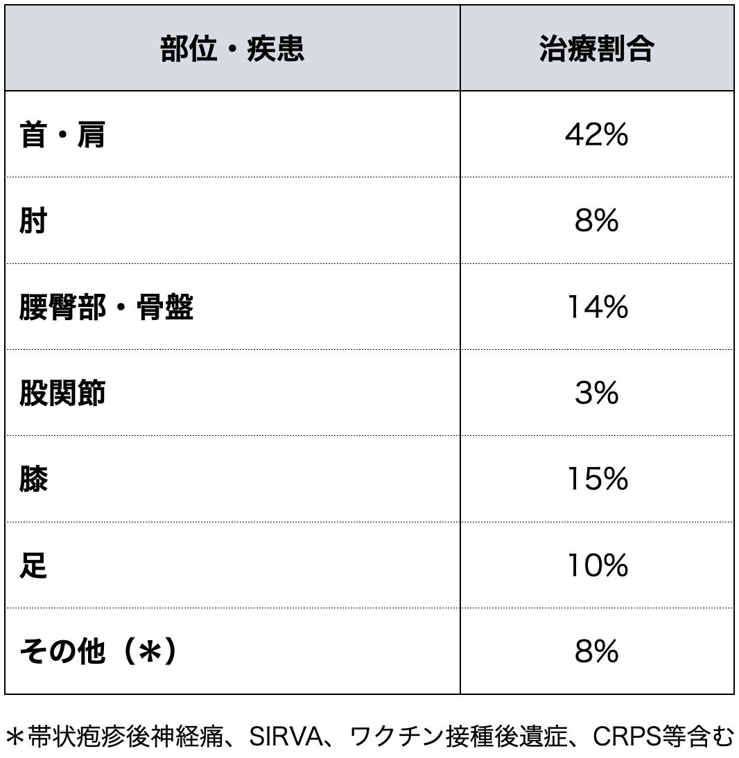 頭痛・食いしばり・顎関節症や顔こり・首こり、肩こり・五十肩などの肩の痛み・テニス肘/ゴルフ肘などの肘の痛み、TFCC損傷・リウマチなどの手首の痛み、ヘバーデン結節・ばね指などの手指の痛み、肋軟骨炎・肋間神経痛などの胸部の痛み、各種腰痛、臀部痛、股関節痛、坐骨神経痛、膝痛、ジャンパー膝・アキレス腱炎などのスポーツ障害、足底筋膜炎・モートン病などの足の痛み、感染症後の痛み、SIRVAなどワクチン接種後の痛み、乳房切除後疼痛症候群(PMPS)などの外科手術後の痛み、帯状疱疹後神経痛・慢性前立腺炎・間質性膀胱炎などの難治性疼痛、その他原因不明の疼痛を含めた幅広い痛みに対して治療実績があります。