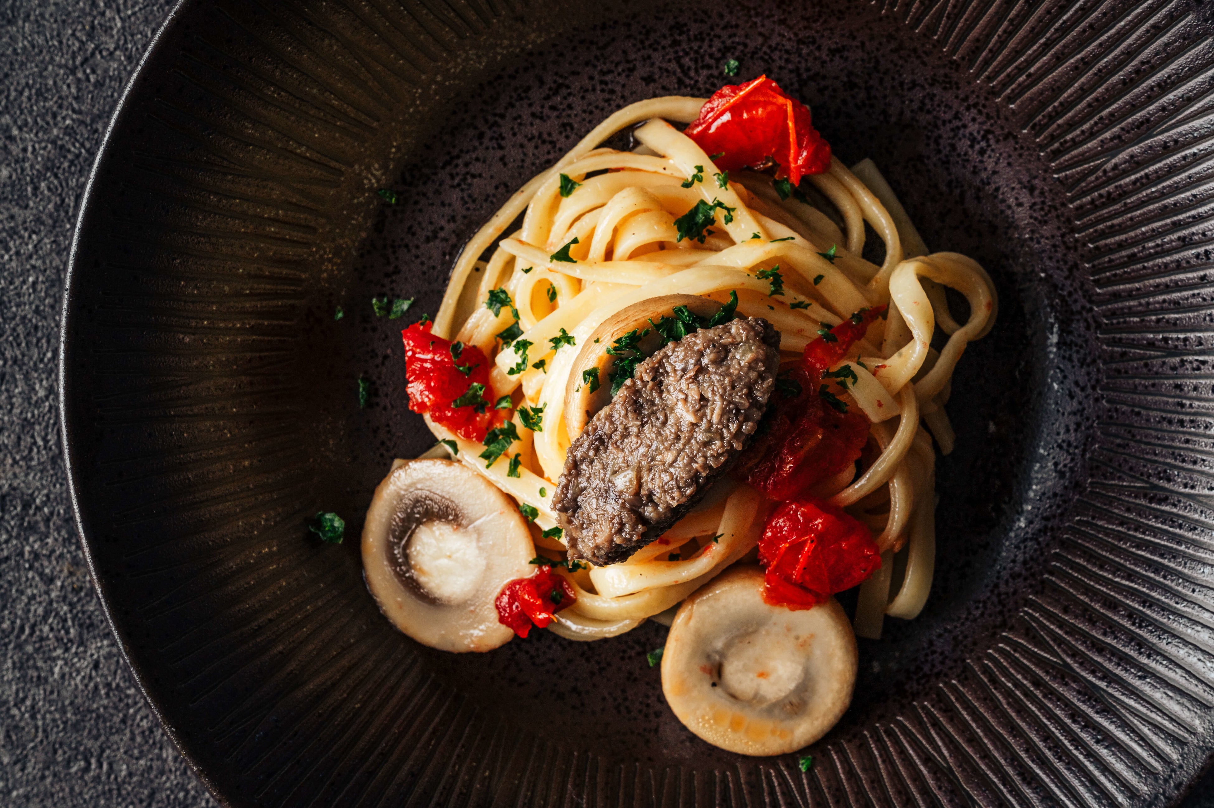 ●ドライトマトとマッシュルームのリングイネ 〜マッシュルームデュクセルを添えて〜