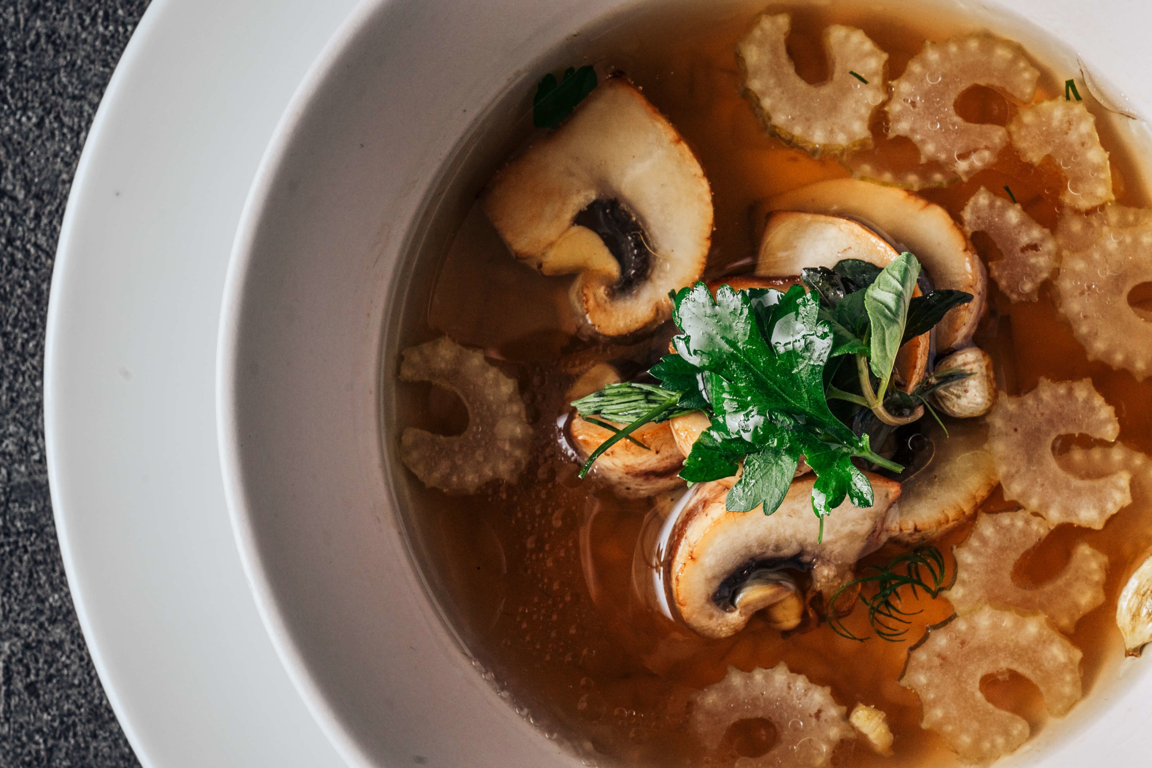 それゆえに、マッシュルームのうま味と香りを存分に味わえます。一品目に温かな出汁をお飲みいただくことで胃を温め、これから続く料理をよりご堪能いただくスターターにふさわしい一皿です。